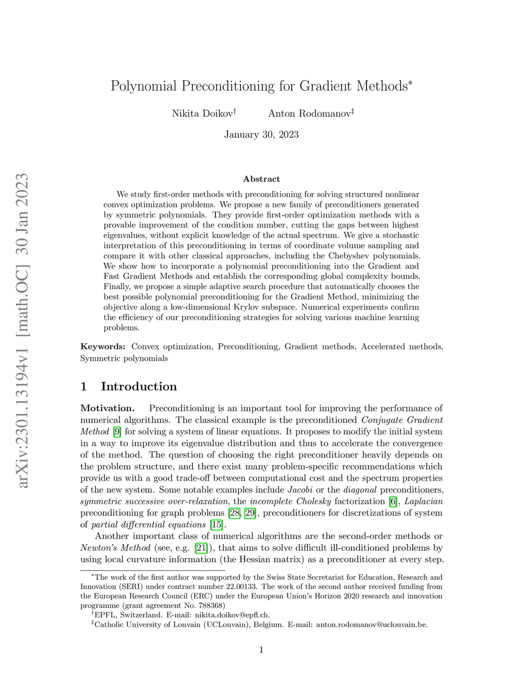 We study first-order methods with preconditioning for solving structured nonlinear convex optimization problems. We propose a new family of preconditioners generated by symmetric polynomials. They provide first-order optimization methods with a provable improvement of the condition number, cutting the gaps between highest eigenvalues, without explicit knowledge of the actual spectrum. We give a stochastic interpretation of this preconditioning in terms of coordinate volume sampling and compare it with other classical approaches, including the Chebyshev polynomials. We show how to incorporate a polynomial preconditioning into the Gradient and Fast Gradient Methods and establish the corresponding global complexity bounds. Finally, we propose a simple adaptive search procedure that automatically chooses the best possible polynomial preconditioning for the Gradient Method, minimizing the objective along a low-dimensional Krylov subspace. Numerical experiments confirm the efficiency of our preconditioning strategies for solving various machine learning problems.