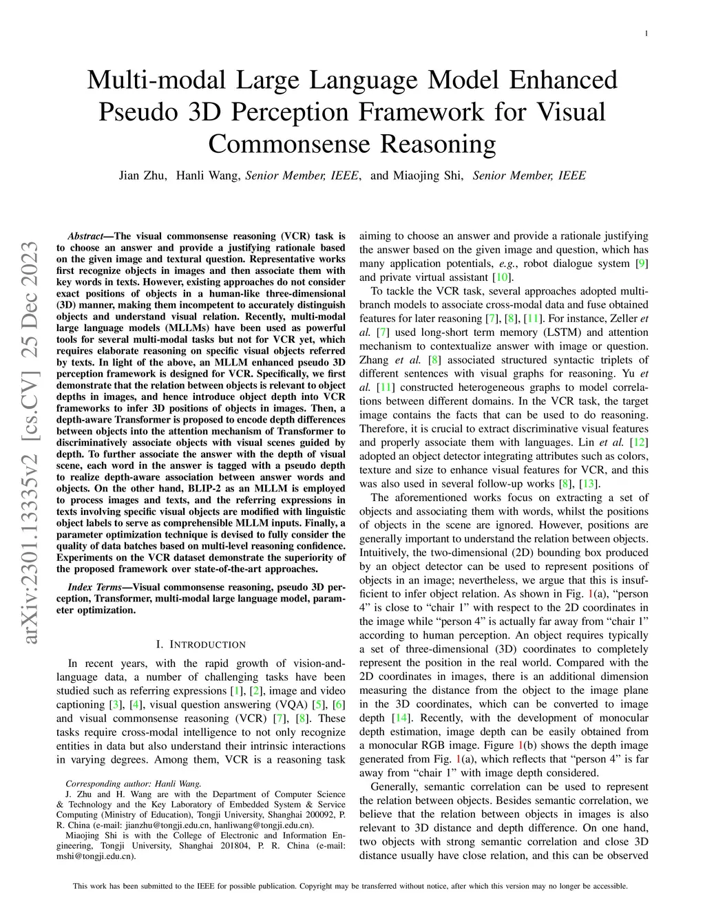 The visual commonsense reasoning (VCR) task is to choose an answer and provide a justifying rationale based on the given image and textural question. Representative works first recognize objects in images and then associate them with key words in texts. However, existing approaches do not consider exact positions of objects in a human-like three-dimensional (3D) manner, making them incompetent to accurately distinguish objects and understand visual relation. Recently, multi-modal large language models (MLLMs) have been used as powerful tools for several multi-modal tasks but not for VCR yet, which requires elaborate reasoning on specific visual objects referred by texts. In light of the above, an MLLM enhanced pseudo 3D perception framework is designed for VCR. Specifically, we first demonstrate that the relation between objects is relevant to object depths in images, and hence introduce object depth into VCR frameworks to infer 3D positions of objects in images. Then, a depth-aware Transformer is proposed to encode depth differences between objects into the attention mechanism of Transformer to discriminatively associate objects with visual scenes guided by depth. To further associate the answer with the depth of visual scene, each word in the answer is tagged with a pseudo depth to realize depth-aware association between answer words and objects. On the other hand, BLIP-2 as an MLLM is employed to process images and texts, and the referring expressions in texts involving specific visual objects are modified with linguistic object labels to serve as comprehensible MLLM inputs. Finally, a parameter optimization technique is devised to fully consider the quality of data batches based on multi-level reasoning confidence. Experiments on the VCR dataset demonstrate the superiority of the proposed framework over state-of-the-art approaches.