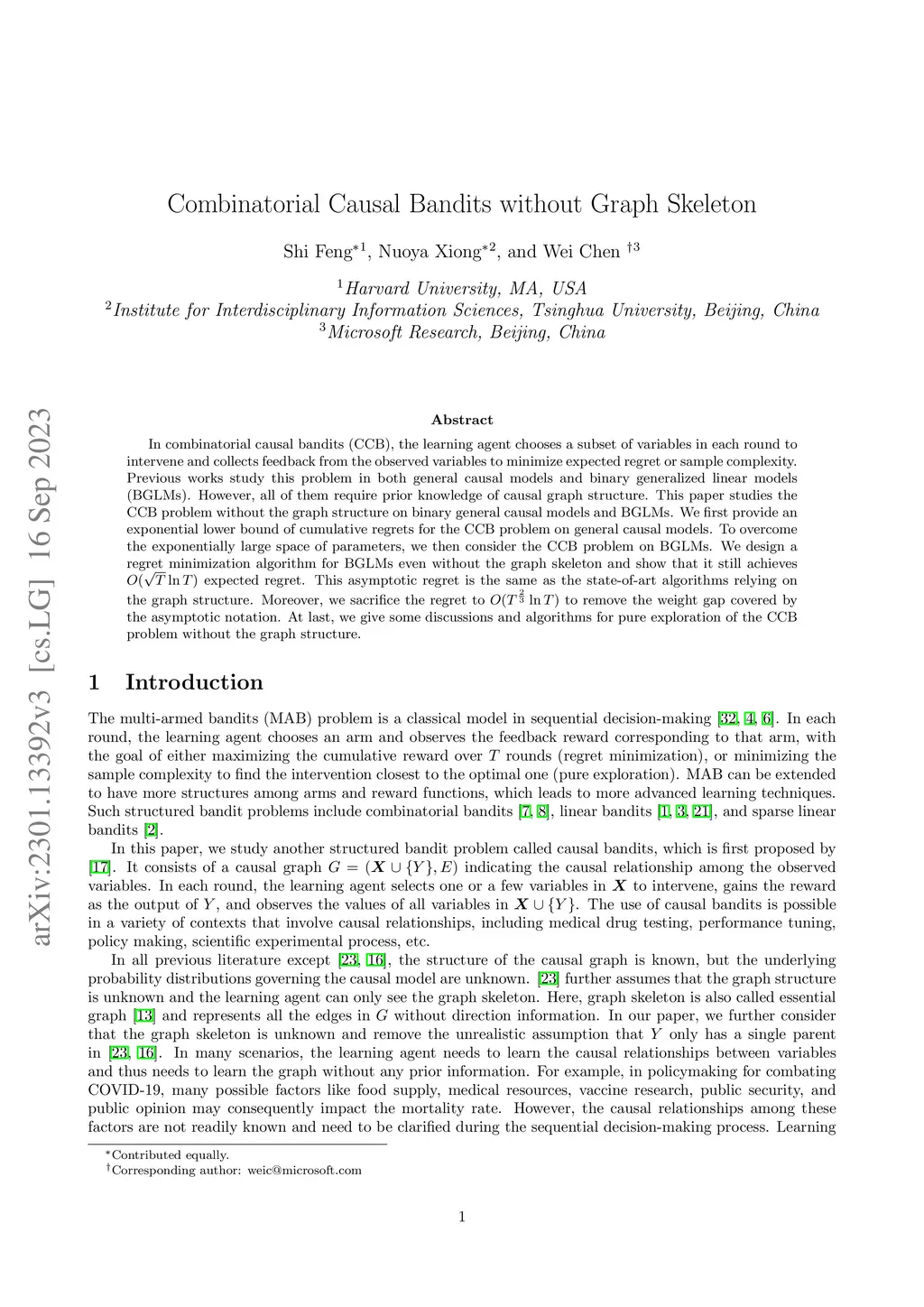 In combinatorial causal bandits (CCB), the learning agent chooses a subset of variables in each round to intervene and collects feedback from the observed variables to minimize expected regret or sample complexity. Previous works study this problem in both general causal models and binary generalized linear models (BGLMs). However, all of them require prior knowledge of causal graph structure. This paper studies the CCB problem without the graph structure on binary general causal models and BGLMs. We first provide an exponential lower bound of cumulative regrets for the CCB problem on general causal models. To overcome the exponentially large space of parameters, we then consider the CCB problem on BGLMs. We design a regret minimization algorithm for BGLMs even without the graph skeleton and show that it still achieves expected regret. This asymptotic regret is the same as the state-of-art algorithms relying on the graph structure. Moreover, we sacrifice the regret to to remove the weight gap covered by the asymptotic notation. At last, we give some discussions and algorithms for pure exploration of the CCB problem without the graph structure.
