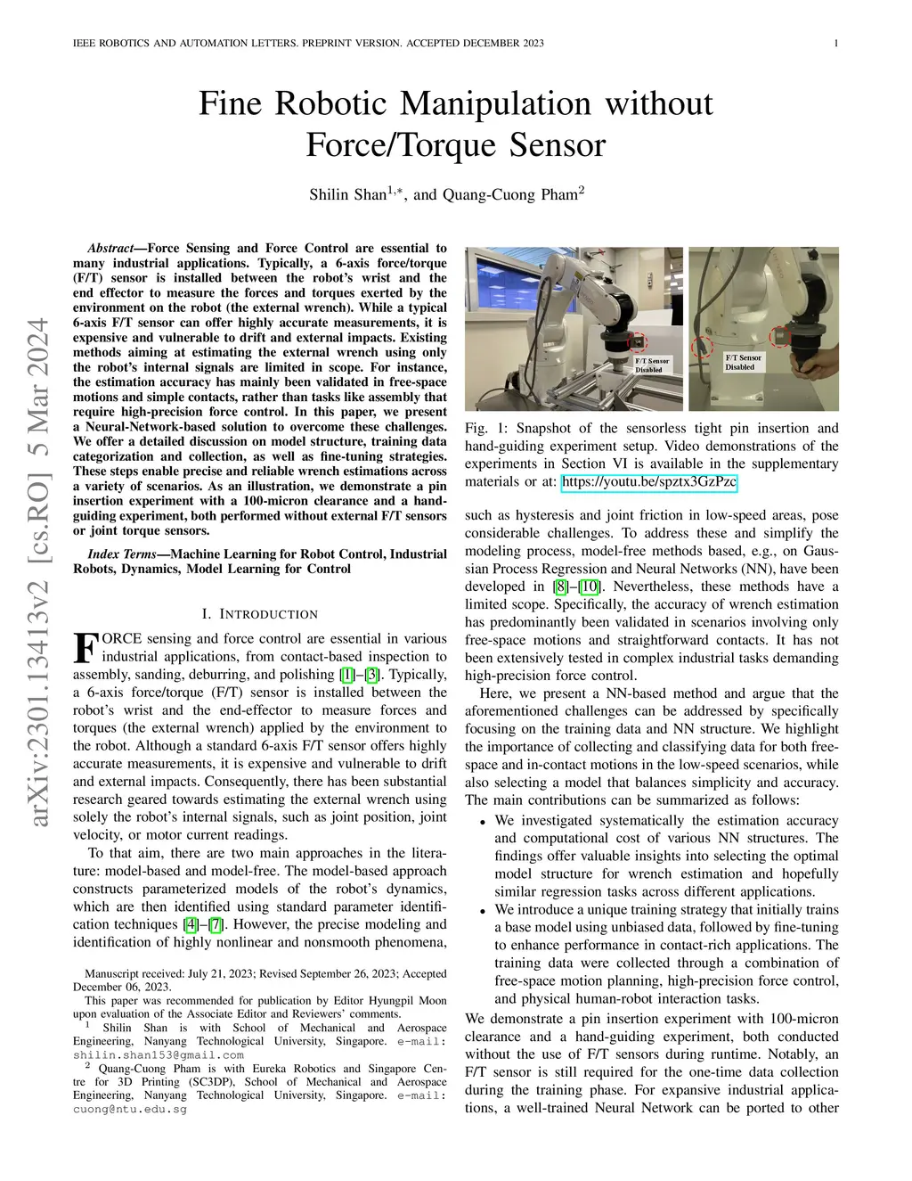 Force Sensing and Force Control are essential to many industrial applications. Typically, a 6-axis Force/Torque (F/T) sensor is mounted between the robot's wrist and the end-effector in order to measure the forces and torques exerted by the environment onto the robot (the external wrench). Although a typical 6-axis F/T sensor can provide highly accurate measurements, it is expensive and vulnerable to drift and external impacts. Existing methods aiming at estimating the external wrench using only the robot's internal signals are limited in scope: for example, wrench estimation accuracy was mostly validated in free-space motions and simple contacts as opposed to tasks like assembly that require high-precision force control. Here we present a Neural Network based method and argue that by devoting particular attention to the training data structure, it is possible to accurately estimate the external wrench in a wide range of scenarios based solely on internal signals. As an illustration, we demonstrate a pin insertion experiment with 100-micron clearance and a hand-guiding experiment, both performed without external F/T sensors or joint torque sensors. Our result opens the possibility of equipping the existing 2.7 million industrial robots with Force Sensing and Force Control capabilities without any additional hardware.