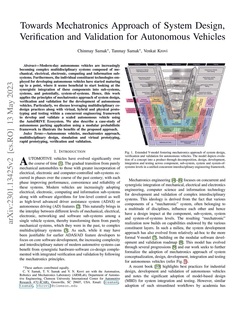 Modern-day autonomous vehicles are increasingly becoming complex multidisciplinary systems composed of mechanical, electrical, electronic, computing and information sub-systems. Furthermore, the individual constituent technologies employed for developing autonomous vehicles have started maturing up to a point, where it seems beneficial to start looking at the synergistic integration of these components into sub-systems, systems, and potentially, system-of-systems. Hence, this work applies the principles of mechatronics approach of system design, verification and validation for the development of autonomous vehicles. Particularly, we discuss leveraging multidisciplinary co-design practices along with virtual, hybrid and physical prototyping and testing within a concurrent engineering framework to develop and validate a scaled autonomous vehicle using the AutoDRIVE ecosystem. We also describe a case-study of autonomous parking application using a modular probabilistic framework to illustrate the benefits of the proposed approach.