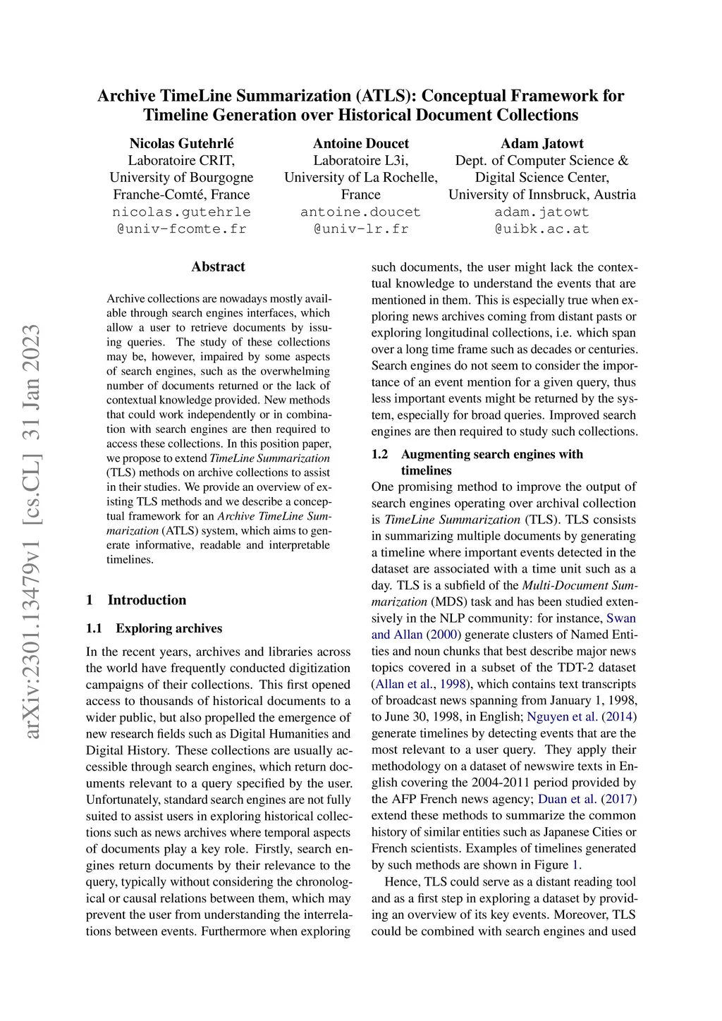 Archive collections are nowadays mostly available through search engines interfaces, which allow a user to retrieve documents by issuing queries. The study of these collections may be, however, impaired by some aspects of search engines, such as the overwhelming number of documents returned or the lack of contextual knowledge provided. New methods that could work independently or in combination with search engines are then required to access these collections. In this position paper, we propose to extend TimeLine Summarization (TLS) methods on archive collections to assist in their studies. We provide an overview of existing TLS methods and we describe a conceptual framework for an Archive TimeLine Summarization (ATLS) system, which aims to generate informative, readable and interpretable timelines.
