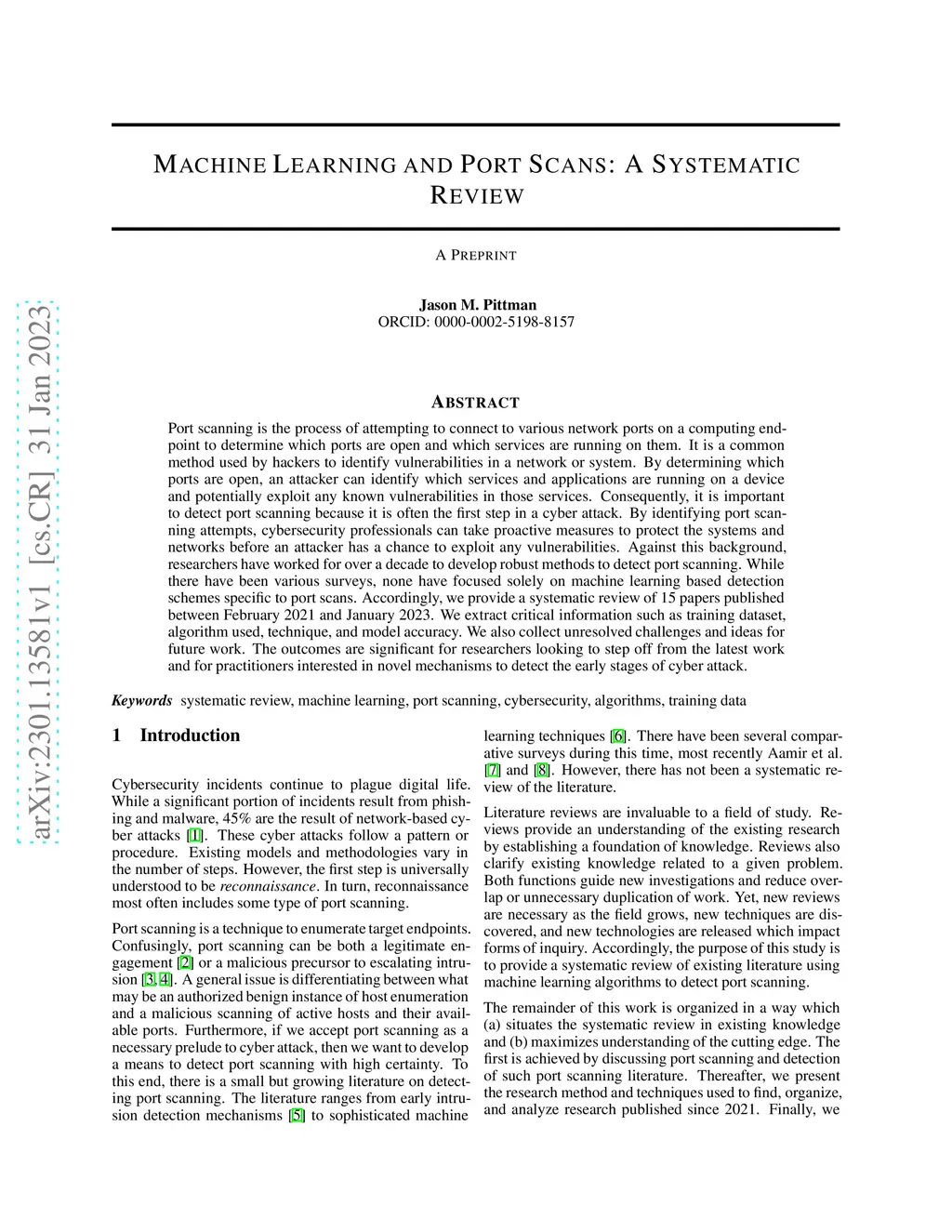 Port scanning is the process of attempting to connect to various network ports on a computing endpoint to determine which ports are open and which services are running on them. It is a common method used by hackers to identify vulnerabilities in a network or system. By determining which ports are open, an attacker can identify which services and applications are running on a device and potentially exploit any known vulnerabilities in those services. Consequently, it is important to detect port scanning because it is often the first step in a cyber attack. By identifying port scanning attempts, cybersecurity professionals can take proactive measures to protect the systems and networks before an attacker has a chance to exploit any vulnerabilities. Against this background, researchers have worked for over a decade to develop robust methods to detect port scanning. While there have been various surveys, none have focused solely on machine learning based detection schemes specific to port scans. Accordingly, we provide a systematic review of 15 papers published between February 2021 and January 2023. We extract critical information such as training dataset, algorithm used, technique, and model accuracy. We also collect unresolved challenges and ideas for future work. The outcomes are significant for researchers looking to step off from the latest work and for practitioners interested in novel mechanisms to detect the early stages of cyber attack.