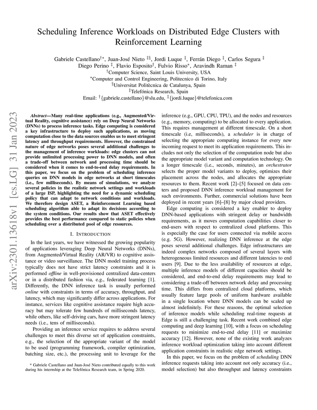 Many real-time applications (e.g., Augmented/Virtual Reality, cognitive assistance) rely on Deep Neural Networks (DNNs) to process inference tasks. Edge computing is considered a key infrastructure to deploy such applications, as moving computation close to the data sources enables us to meet stringent latency and throughput requirements. However, the constrained nature of edge networks poses several additional challenges to the management of inference workloads: edge clusters can not provide unlimited processing power to DNN models, and often a trade-off between network and processing time should be considered when it comes to end-to-end delay requirements. In this paper, we focus on the problem of scheduling inference queries on DNN models in edge networks at short timescales (i.e., few milliseconds). By means of simulations, we analyze several policies in the realistic network settings and workloads of a large ISP, highlighting the need for a dynamic scheduling policy that can adapt to network conditions and workloads. We therefore design ASET, a Reinforcement Learning based scheduling algorithm able to adapt its decisions according to the system conditions. Our results show that ASET effectively provides the best performance compared to static policies when scheduling over a distributed pool of edge resources.