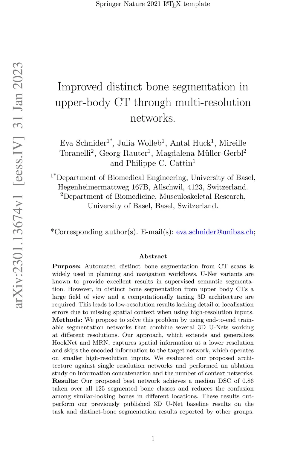 Purpose: Automated distinct bone segmentation from CT scans is widely used in planning and navigation workflows. U-Net variants are known to provide excellent results in supervised semantic segmentation. However, in distinct bone segmentation from upper body CTs a large field of view and a computationally taxing 3D architecture are required. This leads to low-resolution results lacking detail or localisation errors due to missing spatial context when using high-resolution inputs. Methods: We propose to solve this problem by using end-to-end trainable segmentation networks that combine several 3D U-Nets working at different resolutions. Our approach, which extends and generalizes HookNet and MRN, captures spatial information at a lower resolution and skips the encoded information to the target network, which operates on smaller high-resolution inputs. We evaluated our proposed architecture against single resolution networks and performed an ablation study on information concatenation and the number of context networks. Results: Our proposed best network achieves a median DSC of 0.86 taken over all 125 segmented bone classes and reduces the confusion among similar-looking bones in different locations. These results outperform our previously published 3D U-Net baseline results on the task and distinct-bone segmentation results reported by other groups. Conclusion: The presented multi-resolution 3D U-Nets address current shortcomings in bone segmentation from upper-body CT scans by allowing for capturing a larger field of view while avoiding the cubic growth of the input pixels and intermediate computations that quickly outgrow the computational capacities in 3D. The approach thus improves the accuracy and efficiency of distinct bone segmentation from upper-body CT.
