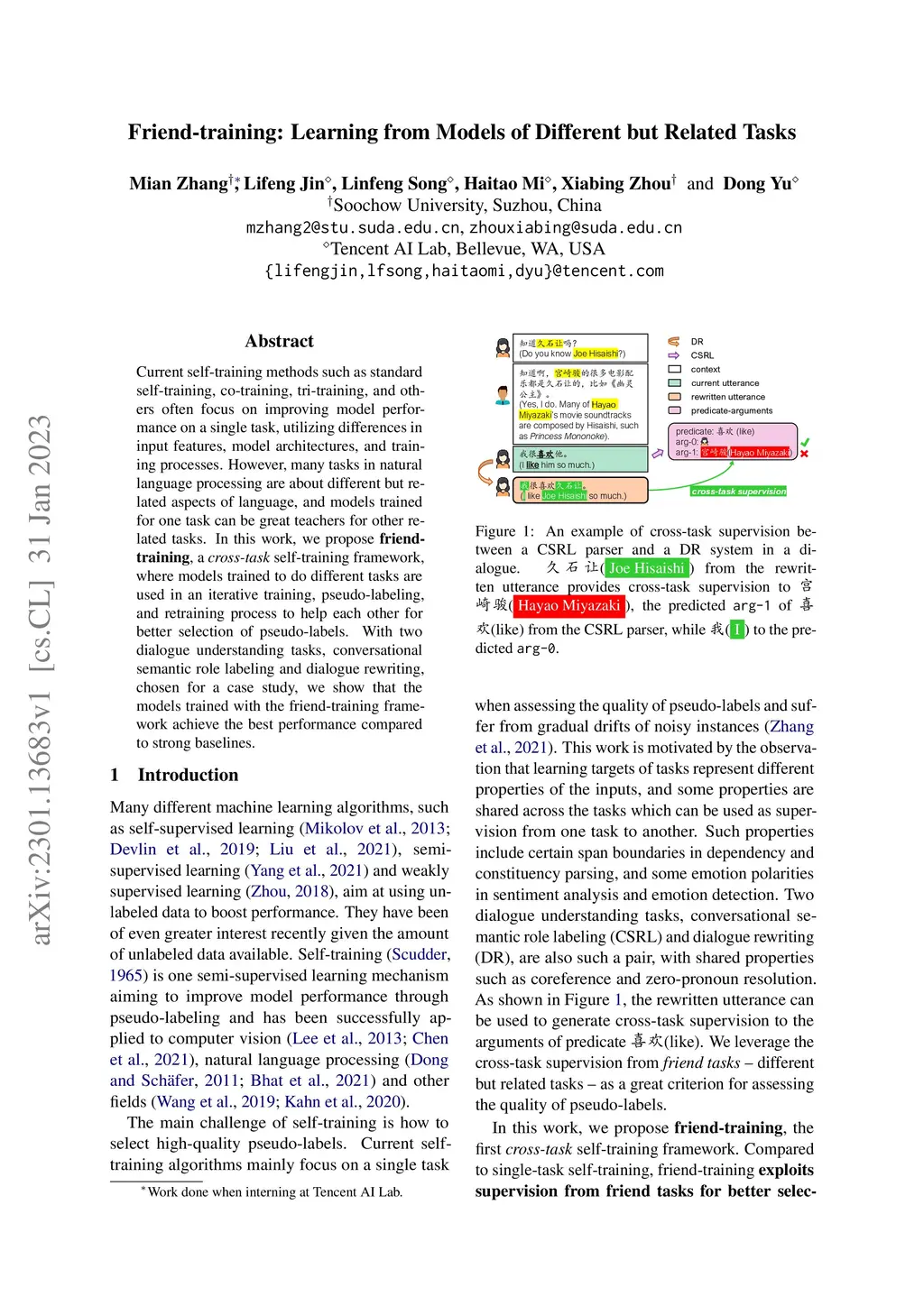 Current self-training methods such as standard self-training, co-training, tri-training, and others often focus on improving model performance on a single task, utilizing differences in input features, model architectures, and training processes. However, many tasks in natural language processing are about different but related aspects of language, and models trained for one task can be great teachers for other related tasks. In this work, we propose friend-training, a cross-task self-training framework, where models trained to do different tasks are used in an iterative training, pseudo-labeling, and retraining process to help each other for better selection of pseudo-labels. With two dialogue understanding tasks, conversational semantic role labeling and dialogue rewriting, chosen for a case study, we show that the models trained with the friend-training framework achieve the best performance compared to strong baselines.