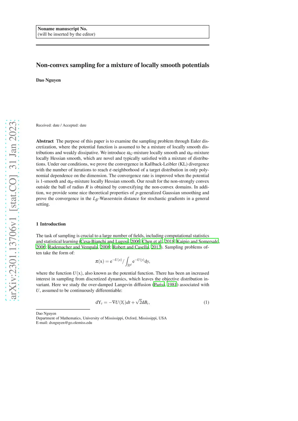 The purpose of this paper is to examine the sampling problem through Euler discretization, where the potential function is assumed to be a mixture of locally smooth distributions and weakly dissipative. We introduce -mixture locally smooth and -mixture locally Hessian smooth, which are novel and typically satisfied with a mixture of distributions. Under our conditions, we prove the convergence in Kullback-Leibler (KL) divergence with the number of iterations to reach -neighborhood of a target distribution in only polynomial dependence on the dimension. The convergence rate is improved when the potential is -smooth and -mixture locally Hessian smooth. Our result for the non-strongly convex outside the ball of radius is obtained by convexifying the non-convex domains. In addition, we provide some nice theoretical properties of -generalized Gaussian smoothing and prove the convergence in the -Wasserstein distance for stochastic gradients in a general setting.