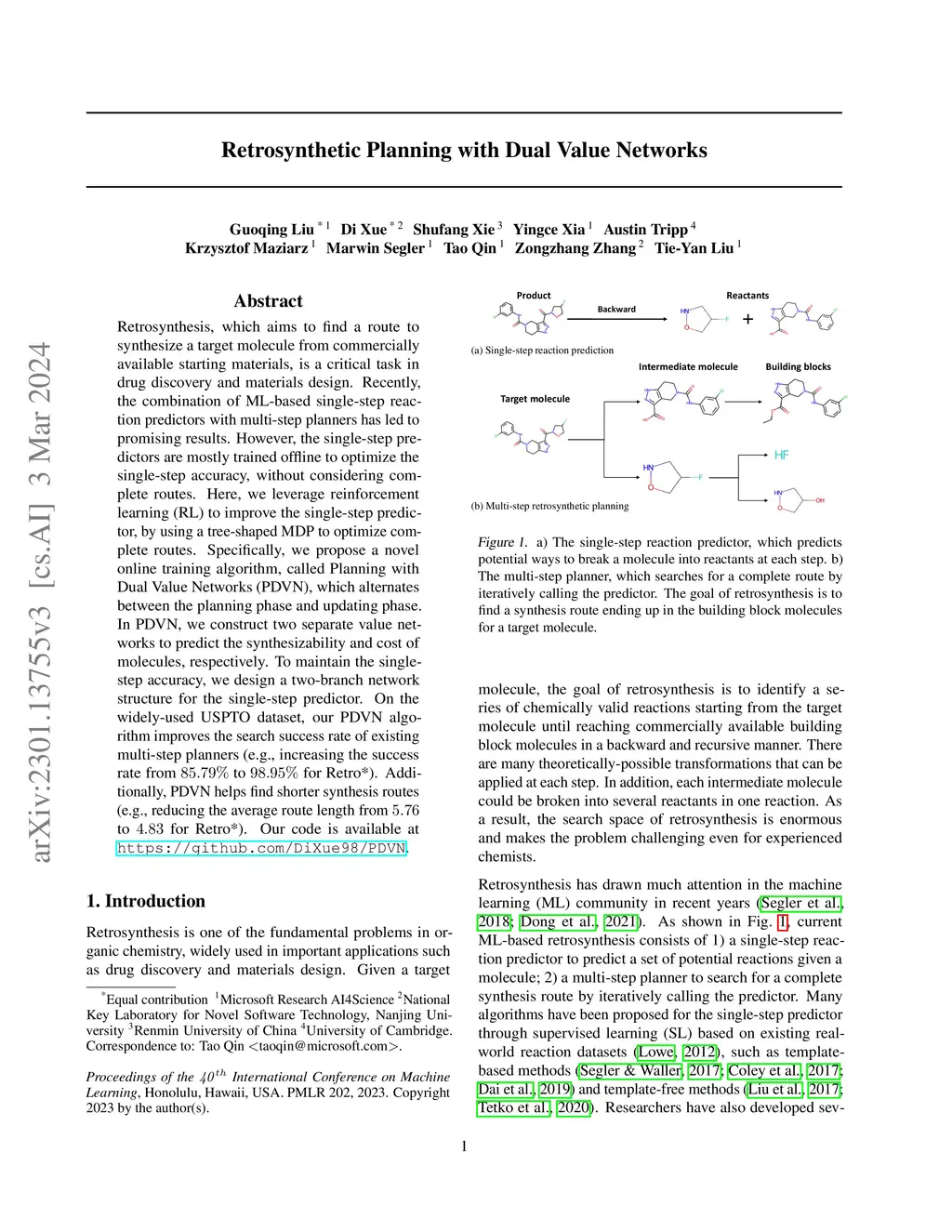 Retrosynthesis, which aims to find a route to synthesize a target molecule from commercially available starting materials, is a critical task in drug discovery and materials design. Recently, the combination of ML-based single-step reaction predictors with multi-step planners has led to promising results. However, the single-step predictors are mostly trained offline to optimize the single-step accuracy, without considering complete routes. Here, we leverage reinforcement learning (RL) to improve the single-step predictor, by using a tree-shaped MDP to optimize complete routes. Specifically, we propose a novel online training algorithm, called Planning with Dual Value Networks (PDVN), which alternates between the planning phase and updating phase. In PDVN, we construct two separate value networks to predict the synthesizability and cost of molecules, respectively. To maintain the single-step accuracy, we design a two-branch network structure for the single-step predictor. On the widely-used USPTO dataset, our PDVN algorithm improves the search success rate of existing multi-step planners (e.g., increasing the success rate from 85.79% to 98.95% for Retro*, and reducing the number of model calls by half while solving 99.47% molecules for RetroGraph). Additionally, PDVN helps find shorter synthesis routes (e.g., reducing the average route length from 5.76 to 4.83 for Retro*, and from 5.63 to 4.78 for RetroGraph). Our code is available at \url{https://github.com/DiXue98/PDVN}.
