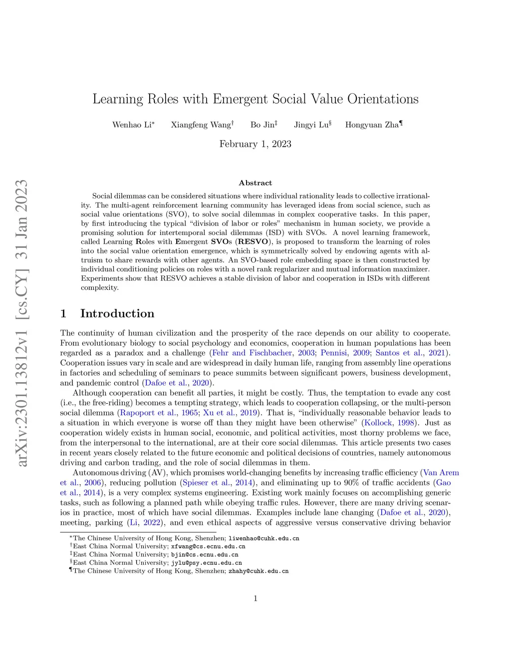Social dilemmas can be considered situations where individual rationality leads to collective irrationality. The multi-agent reinforcement learning community has leveraged ideas from social science, such as social value orientations (SVO), to solve social dilemmas in complex cooperative tasks. In this paper, by first introducing the typical "division of labor or roles" mechanism in human society, we provide a promising solution for intertemporal social dilemmas (ISD) with SVOs. A novel learning framework, called Learning Roles with Emergent SVOs (RESVO), is proposed to transform the learning of roles into the social value orientation emergence, which is symmetrically solved by endowing agents with altruism to share rewards with other agents. An SVO-based role embedding space is then constructed by individual conditioning policies on roles with a novel rank regularizer and mutual information maximizer. Experiments show that RESVO achieves a stable division of labor and cooperation in ISDs with different complexity.