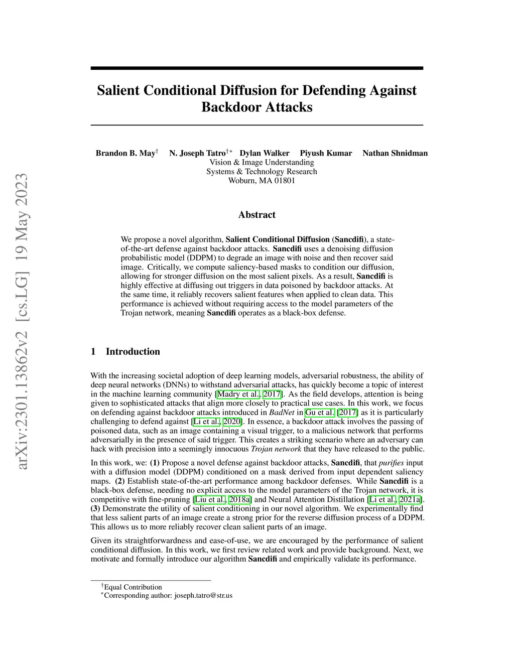 We propose a novel algorithm, Salient Conditional Diffusion (Sancdifi), a state-of-the-art defense against backdoor attacks. Sancdifi uses a denoising diffusion probabilistic model (DDPM) to degrade an image with noise and then recover said image using the learned reverse diffusion. Critically, we compute saliency map-based masks to condition our diffusion, allowing for stronger diffusion on the most salient pixels by the DDPM. As a result, Sancdifi is highly effective at diffusing out triggers in data poisoned by backdoor attacks. At the same time, it reliably recovers salient features when applied to clean data. This performance is achieved without requiring access to the model parameters of the Trojan network, meaning Sancdifi operates as a black-box defense.
