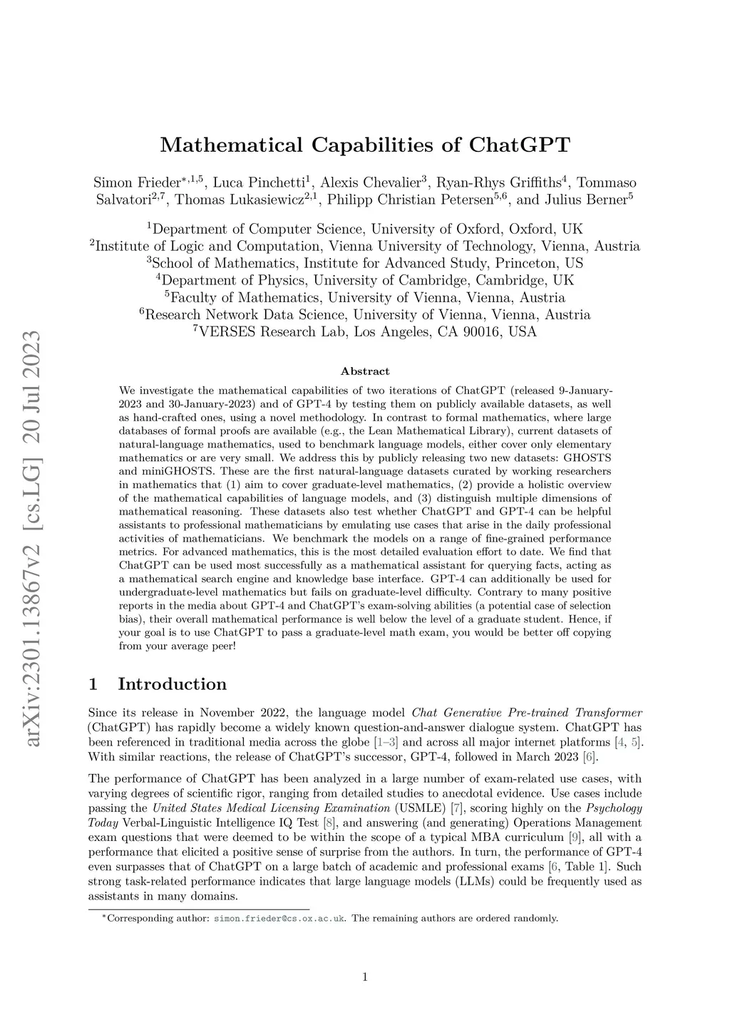 We investigate the mathematical capabilities of ChatGPT by testing it on publicly available datasets, as well as hand-crafted ones, and measuring its performance against other models trained on a mathematical corpus, such as Minerva. We also test whether ChatGPT can be a useful assistant to professional mathematicians by emulating various use cases that come up in the daily professional activities of mathematicians (question answering, theorem searching). In contrast to formal mathematics, where large databases of formal proofs are available (e.g., the Lean Mathematical Library), current datasets of natural-language mathematics, used to benchmark language models, only cover elementary mathematics. We address this issue by introducing a new dataset: GHOSTS. It is the first natural-language dataset made and curated by working researchers in mathematics that (1) aims to cover graduate-level mathematics and (2) provides a holistic overview of the mathematical capabilities of language models. We benchmark ChatGPT on GHOSTS and evaluate performance against fine-grained criteria. We make this new dataset publicly available to assist a community-driven comparison of ChatGPT with (future) large language models in terms of advanced mathematical comprehension. We conclude that contrary to many positive reports in the media (a potential case of selection bias), ChatGPT's mathematical abilities are significantly below those of an average mathematics graduate student. Our results show that ChatGPT often understands the question but fails to provide correct solutions. Hence, if your goal is to use it to pass a university exam, you would be better off copying from your average peer!