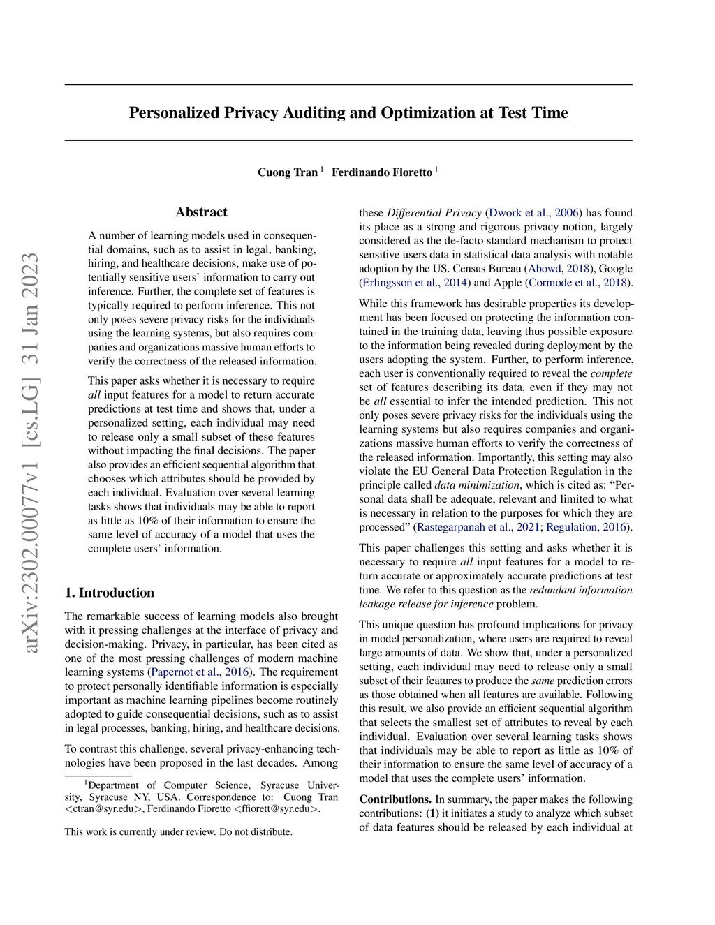 A number of learning models used in consequential domains, such as to assist in legal, banking, hiring, and healthcare decisions, make use of potentially sensitive users' information to carry out inference. Further, the complete set of features is typically required to perform inference. This not only poses severe privacy risks for the individuals using the learning systems, but also requires companies and organizations massive human efforts to verify the correctness of the released information. This paper asks whether it is necessary to require \emph{all} input features for a model to return accurate predictions at test time and shows that, under a personalized setting, each individual may need to release only a small subset of these features without impacting the final decisions. The paper also provides an efficient sequential algorithm that chooses which attributes should be provided by each individual. Evaluation over several learning tasks shows that individuals may be able to report as little as 10\% of their information to ensure the same level of accuracy of a model that uses the complete users' information.