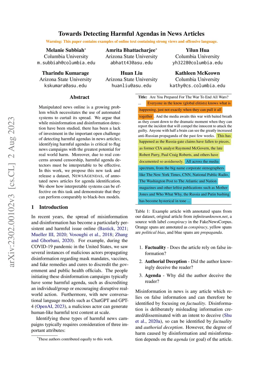 Manipulated news online is a growing problem which necessitates the use of automated systems to curtail its spread. We argue that while misinformation and disinformation detection have been studied, there has been a lack of investment in the important open challenge of detecting harmful agendas in news articles; identifying harmful agendas is critical to flag news campaigns with the greatest potential for real world harm. Moreover, due to real concerns around censorship, harmful agenda detectors must be interpretable to be effective. In this work, we propose this new task and release a dataset, NewsAgendas, of annotated news articles for agenda identification. We show how interpretable systems can be effective on this task and demonstrate that they can perform comparably to black-box models.