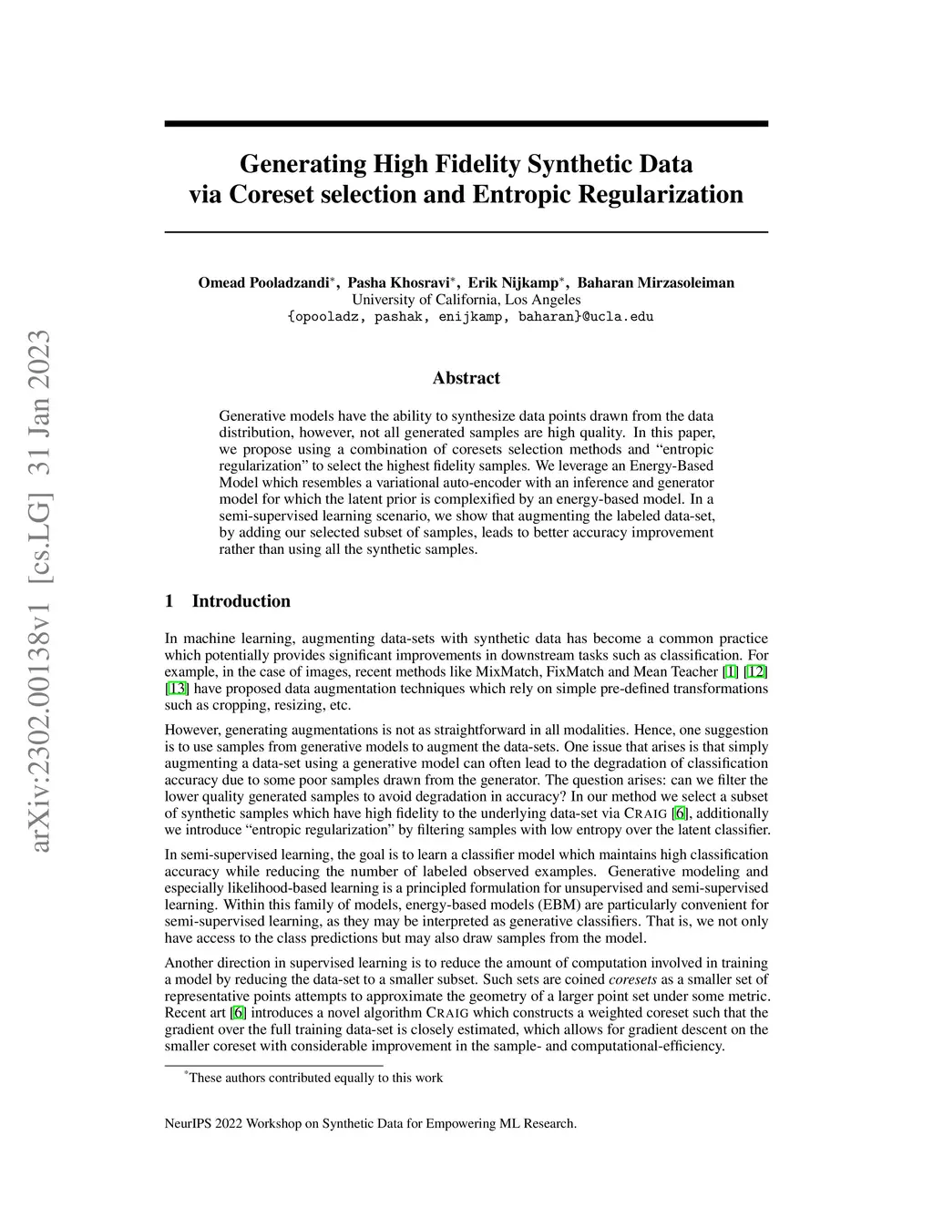 Generative models have the ability to synthesize data points drawn from the data distribution, however, not all generated samples are high quality. In this paper, we propose using a combination of coresets selection methods and ``entropic regularization'' to select the highest fidelity samples. We leverage an Energy-Based Model which resembles a variational auto-encoder with an inference and generator model for which the latent prior is complexified by an energy-based model. In a semi-supervised learning scenario, we show that augmenting the labeled data-set, by adding our selected subset of samples, leads to better accuracy improvement rather than using all the synthetic samples.