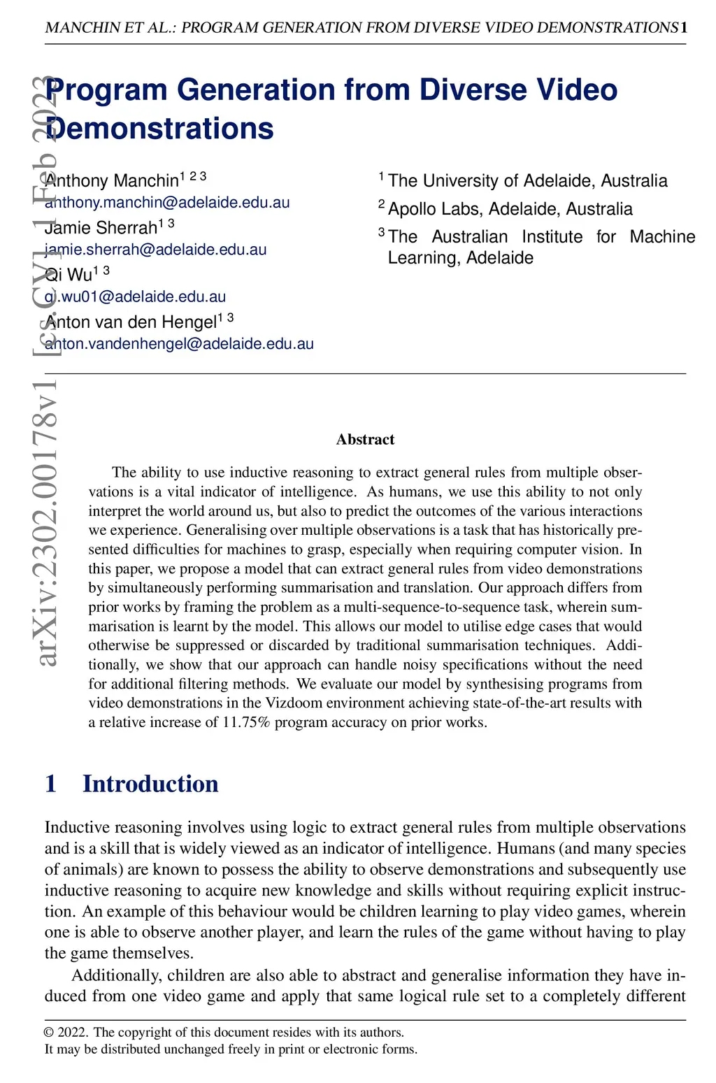 The ability to use inductive reasoning to extract general rules from multiple observations is a vital indicator of intelligence. As humans, we use this ability to not only interpret the world around us, but also to predict the outcomes of the various interactions we experience. Generalising over multiple observations is a task that has historically presented difficulties for machines to grasp, especially when requiring computer vision. In this paper, we propose a model that can extract general rules from video demonstrations by simultaneously performing summarisation and translation. Our approach differs from prior works by framing the problem as a multi-sequence-to-sequence task, wherein summarisation is learnt by the model. This allows our model to utilise edge cases that would otherwise be suppressed or discarded by traditional summarisation techniques. Additionally, we show that our approach can handle noisy specifications without the need for additional filtering methods. We evaluate our model by synthesising programs from video demonstrations in the Vizdoom environment achieving state-of-the-art results with a relative increase of 11.75% program accuracy on prior works