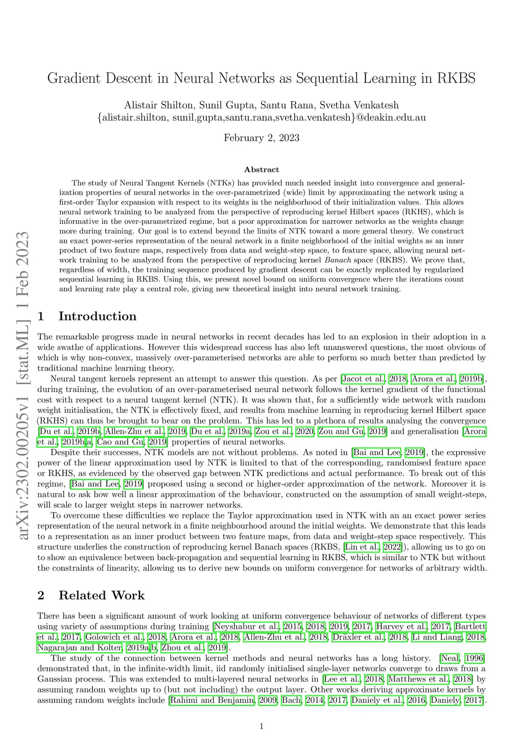 The study of Neural Tangent Kernels (NTKs) has provided much needed insight into convergence and generalization properties of neural networks in the over-parametrized (wide) limit by approximating the network using a first-order Taylor expansion with respect to its weights in the neighborhood of their initialization values. This allows neural network training to be analyzed from the perspective of reproducing kernel Hilbert spaces (RKHS), which is informative in the over-parametrized regime, but a poor approximation for narrower networks as the weights change more during training. Our goal is to extend beyond the limits of NTK toward a more general theory. We construct an exact power-series representation of the neural network in a finite neighborhood of the initial weights as an inner product of two feature maps, respectively from data and weight-step space, to feature space, allowing neural network training to be analyzed from the perspective of reproducing kernel {\em Banach} space (RKBS). We prove that, regardless of width, the training sequence produced by gradient descent can be exactly replicated by regularized sequential learning in RKBS. Using this, we present novel bound on uniform convergence where the iterations count and learning rate play a central role, giving new theoretical insight into neural network training.