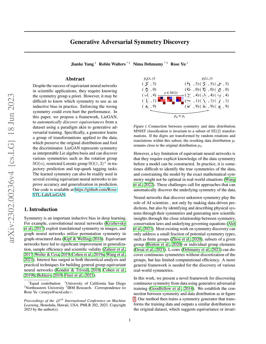 Despite the success of equivariant neural networks in scientific applications, they require knowing the symmetry group a priori. However, it may be difficult to know which symmetry to use as an inductive bias in practice. Enforcing the wrong symmetry could even hurt the performance. In this paper, we propose a framework, LieGAN, to automatically discover equivariances from a dataset using a paradigm akin to generative adversarial training. Specifically, a generator learns a group of transformations applied to the data, which preserve the original distribution and fool the discriminator. LieGAN represents symmetry as interpretable Lie algebra basis and can discover various symmetries such as the rotation group , restricted Lorentz group in trajectory prediction and top-quark tagging tasks. The learned symmetry can also be readily used in several existing equivariant neural networks to improve accuracy and generalization in prediction.