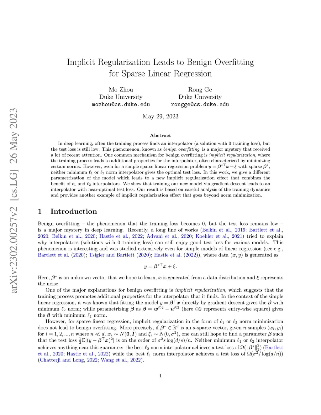 In deep learning, often the training process finds an interpolator (a solution with 0 training loss), but the test loss is still low. This phenomenon, known as benign overfitting, is a major mystery that received a lot of recent attention. One common mechanism for benign overfitting is implicit regularization, where the training process leads to additional properties for the interpolator, often characterized by minimizing certain norms. However, even for a simple sparse linear regression problem with sparse , neither minimum or norm interpolator gives the optimal test loss. In this work, we give a different parametrization of the model which leads to a new implicit regularization effect that combines the benefit of and interpolators. We show that training our new model via gradient descent leads to an interpolator with near-optimal test loss. Our result is based on careful analysis of the training dynamics and provides another example of implicit regularization effect that goes beyond norm minimization.