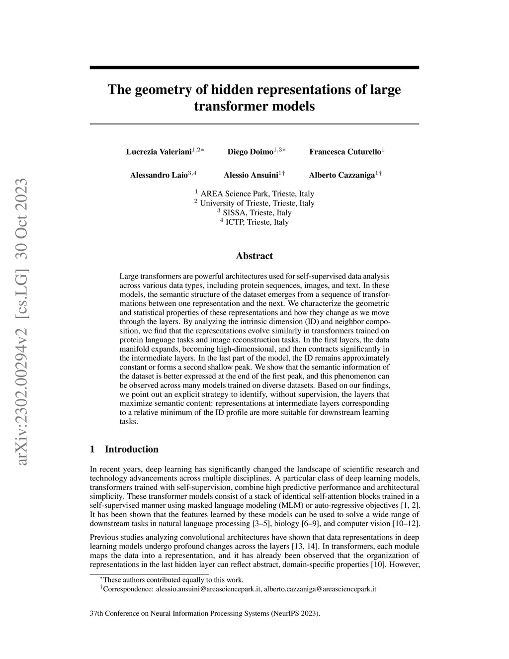 Large transformers are powerful architectures used for self-supervised data analysis across various data types, including protein sequences, images, and text. In these models, the semantic structure of the dataset emerges from a sequence of transformations between one representation and the next. We characterize the geometric and statistical properties of these representations and how they change as we move through the layers. By analyzing the intrinsic dimension (ID) and neighbor composition, we find that the representations evolve similarly in transformers trained on protein language tasks and image reconstruction tasks. In the first layers, the data manifold expands, becoming high-dimensional, and then contracts significantly in the intermediate layers. In the last part of the model, the ID remains approximately constant or forms a second shallow peak. We show that the semantic information of the dataset is better expressed at the end of the first peak, and this phenomenon can be observed across many models trained on diverse datasets. Based on our findings, we point out an explicit strategy to identify, without supervision, the layers that maximize semantic content: representations at intermediate layers corresponding to a relative minimum of the ID profile are more suitable for downstream learning tasks.