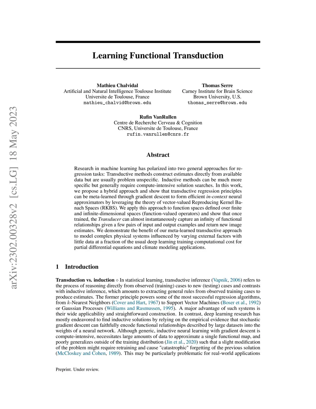 Research in machine learning has polarized into two general approaches for regression tasks: Transductive methods construct estimates directly from available data but are usually problem unspecific. Inductive methods can be much more specific but generally require compute-intensive solution searches. In this work, we propose a hybrid approach and show that transductive regression principles can be meta-learned through gradient descent to form efficient in-context neural approximators by leveraging the theory of vector-valued Reproducing Kernel Banach Spaces (RKBS). We apply this approach to function spaces defined over finite and infinite-dimensional spaces (function-valued operators) and show that once trained, the Transducer can almost instantaneously capture an infinity of functional relationships given a few pairs of input and output examples and return new image estimates. We demonstrate the benefit of our meta-learned transductive approach to model complex physical systems influenced by varying external factors with little data at a fraction of the usual deep learning training computational cost for partial differential equations and climate modeling applications.