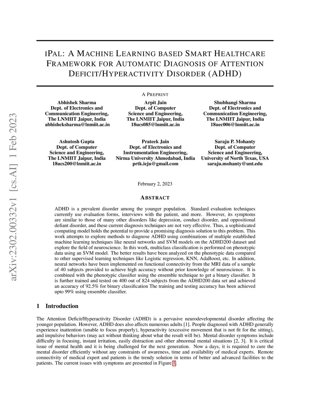 ADHD is a prevalent disorder among the younger population. Standard evaluation techniques currently use evaluation forms, interviews with the patient, and more. However, its symptoms are similar to those of many other disorders like depression, conduct disorder, and oppositional defiant disorder, and these current diagnosis techniques are not very effective. Thus, a sophisticated computing model holds the potential to provide a promising diagnosis solution to this problem. This work attempts to explore methods to diagnose ADHD using combinations of multiple established machine learning techniques like neural networks and SVM models on the ADHD200 dataset and explore the field of neuroscience. In this work, multiclass classification is performed on phenotypic data using an SVM model. The better results have been analyzed on the phenotypic data compared to other supervised learning techniques like Logistic regression, KNN, AdaBoost, etc. In addition, neural networks have been implemented on functional connectivity from the MRI data of a sample of 40 subjects provided to achieve high accuracy without prior knowledge of neuroscience. It is combined with the phenotypic classifier using the ensemble technique to get a binary classifier. It is further trained and tested on 400 out of 824 subjects from the ADHD200 data set and achieved an accuracy of 92.5% for binary classification The training and testing accuracy has been achieved upto 99% using ensemble classifier.