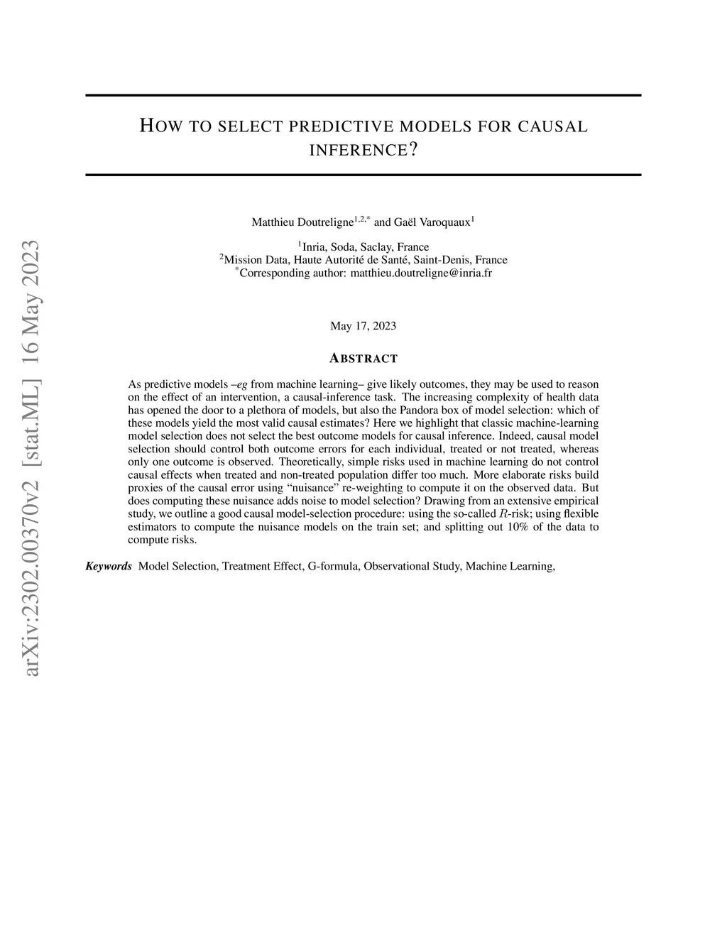 As predictive models -- e.g., from machine learning -- give likely outcomes, they may be used to reason on the effect of an intervention, a causal-inference task. The increasing complexity of health data has opened the door to a plethora of models, but also the Pandora box of model selection: which of these models yield the most valid causal estimates? Here we highlight that classic machine-learning model selection does not select the best outcome models for causal inference. Indeed, causal model selection should control both outcome errors for each individual, treated or not treated, whereas only one outcome is observed. Theoretically, simple risks used in machine learning do not control causal effects when treated and non-treated population differ too much. More elaborate risks build proxies of the causal error using ``nuisance'' re-weighting to compute it on the observed data. But does computing these nuisance adds noise to model selection? Drawing from an extensive empirical study, we outline a good causal model-selection procedure: using the so-called ; using flexible estimators to compute the nuisance models on the train set; and splitting out 10\% of the data to compute risks.