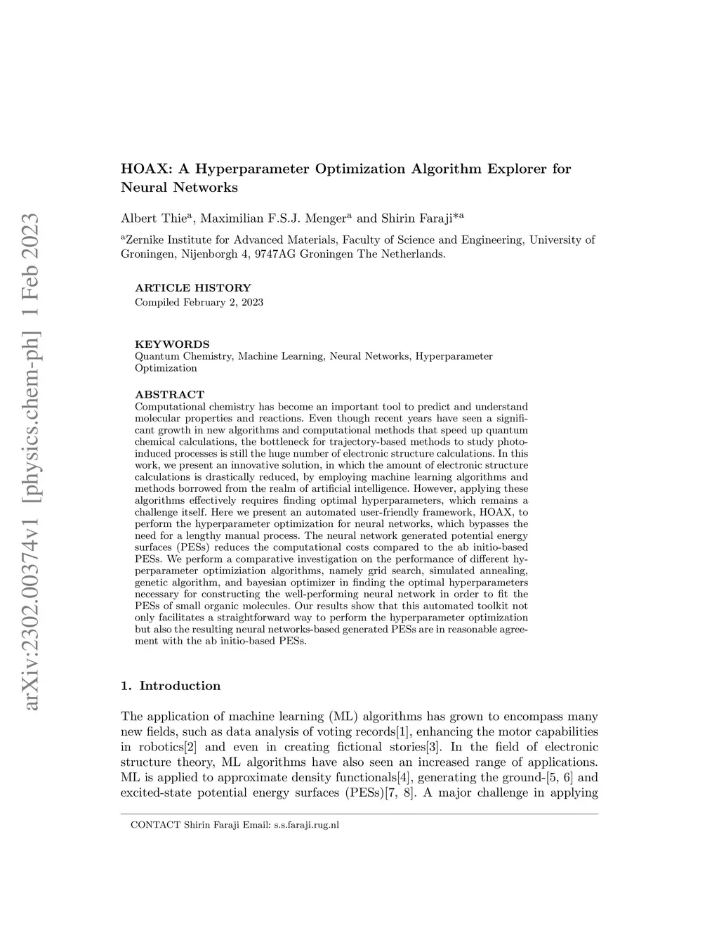 Computational chemistry has become an important tool to predict and understand molecular properties and reactions. Even though recent years have seen a significant growth in new algorithms and computational methods that speed up quantum chemical calculations, the bottleneck for trajectory-based methods to study photoinduced processes is still the huge number of electronic structure calculations. In this work, we present an innovative solution, in which the amount of electronic structure calculations is drastically reduced, by employing machine learning algorithms and methods borrowed from the realm of artificial intelligence. However, applying these algorithms effectively requires finding optimal hyperparameters, which remains a challenge itself. Here we present an automated user-friendly framework, HOAX, to perform the hyperparameter optimization for neural networks, which bypasses the need for a lengthy manual process. The neural network generated potential energy surfaces (PESs) reduces the computational costs compared to the ab initio-based PESs. We perform a comparative investigation on the performance of different hyperparameter optimiziation algorithms, namely grid search, simulated annealing, genetic algorithm, and bayesian optimizer in finding the optimal hyperparameters necessary for constructing the well-performing neural network in order to fit the PESs of small organic molecules. Our results show that this automated toolkit not only facilitate a straightforward way to perform the hyperparameter optimization but also the resulting neural networks-based generated PESs are in reasonable agreement with the ab initio-based PESs.