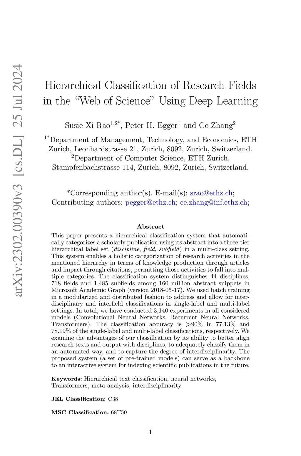 This paper presents a hierarchical classification system that automatically categorizes a scholarly publication using its abstract into a three-tier hierarchical label set (discipline, field, subfield) in a multi-class setting. This system enables a holistic categorization of research activities in the mentioned hierarchy in terms of knowledge production through articles and impact through citations, permitting those activities to fall into multiple categories. The classification system distinguishes 44 disciplines, 718 fields and 1,485 subfields among 160 million abstract snippets in Microsoft Academic Graph (version 2018-05-17). We used batch training in a modularized and distributed fashion to address and allow for interdisciplinary and interfield classifications in single-label and multi-label settings. In total, we have conducted 3,140 experiments in all considered models (Convolutional Neural Networks, Recurrent Neural Networks, Transformers). The classification accuracy is > 90% in 77.13% and 78.19% of the single-label and multi-label classifications, respectively. We examine the advantages of our classification by its ability to better align research texts and output with disciplines, to adequately classify them in an automated way, and to capture the degree of interdisciplinarity. The proposed system (a set of pre-trained models) can serve as a backbone to an interactive system for indexing scientific publications in the future.