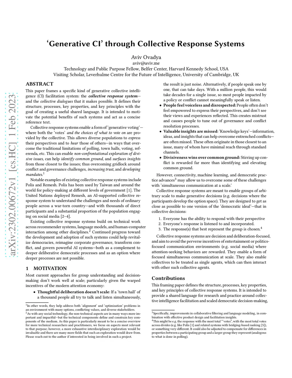 How can many people (who may disagree) come together to answer a question or make a decision? "Collective response systems" are a type of generative collective intelligence (CI) facilitation process meant to address this challenge. They enable a form of "generative voting", where both the votes, and the choices of what to vote on, are provided by the group. Such systems overcome the traditional limitations of polling, town halls, standard voting, referendums, etc. The generative CI outputs of collective response systems can also be chained together into iterative "collective dialogues", analogously to some kinds of generative AI. Technical advances across domains including recommender systems, language models, and human-computer interaction have led to the development of innovative and scalable collective response systems. For example, Polis has been used around the world to support policy-making at different levels of government, and Remesh has been used by the UN to understand the challenges and needs of ordinary people across war-torn countries. This paper aims to develop a shared language by defining the structure, processes, properties, and principles of such systems. Collective response systems allow non-confrontational exploration of divisive issues, help identify common ground, and elicit insights from those closest to the issues. As a result, they can help overcome gridlock around conflict and governance challenges, increase trust, and develop mandates. Continued progress toward their development and adoption could help revitalize democracies, reimagine corporate governance, transform conflict, and govern powerful AI systems -- both as a complement to deeper deliberative democratic processes and as an option where deeper processes are not applicable or possible.