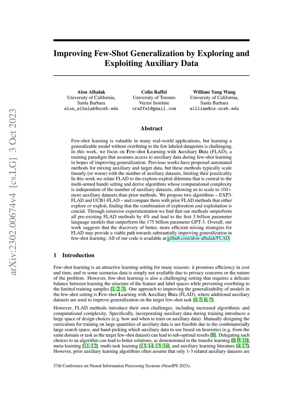Few-shot learning is valuable in many real-world applications, but learning a generalizable model without overfitting to the few labeled datapoints is challenging. In this work, we focus on Few-shot Learning with Auxiliary Data (FLAD), a training paradigm that assumes access to auxiliary data during few-shot learning in hopes of improving generalization. Previous works have proposed automated methods for mixing auxiliary and target data, but these methods typically scale linearly (or worse) with the number of auxiliary datasets, limiting their practicality. In this work we relate FLAD to the explore-exploit dilemma that is central to the multi-armed bandit setting and derive algorithms whose computational complexity is independent of the number of auxiliary datasets, allowing us to scale to 100x more auxiliary datasets than prior methods. We propose two algorithms -- EXP3-FLAD and UCB1-FLAD -- and compare them with prior FLAD methods that either explore or exploit, finding that the combination of exploration and exploitation is crucial. Through extensive experimentation we find that our methods outperform all pre-existing FLAD methods by 4% and lead to the first 3 billion parameter language models that outperform the 175 billion parameter GPT-3. Overall, our work suggests that the discovery of better, more efficient mixing strategies for FLAD may provide a viable path towards substantially improving generalization in few-shot learning.