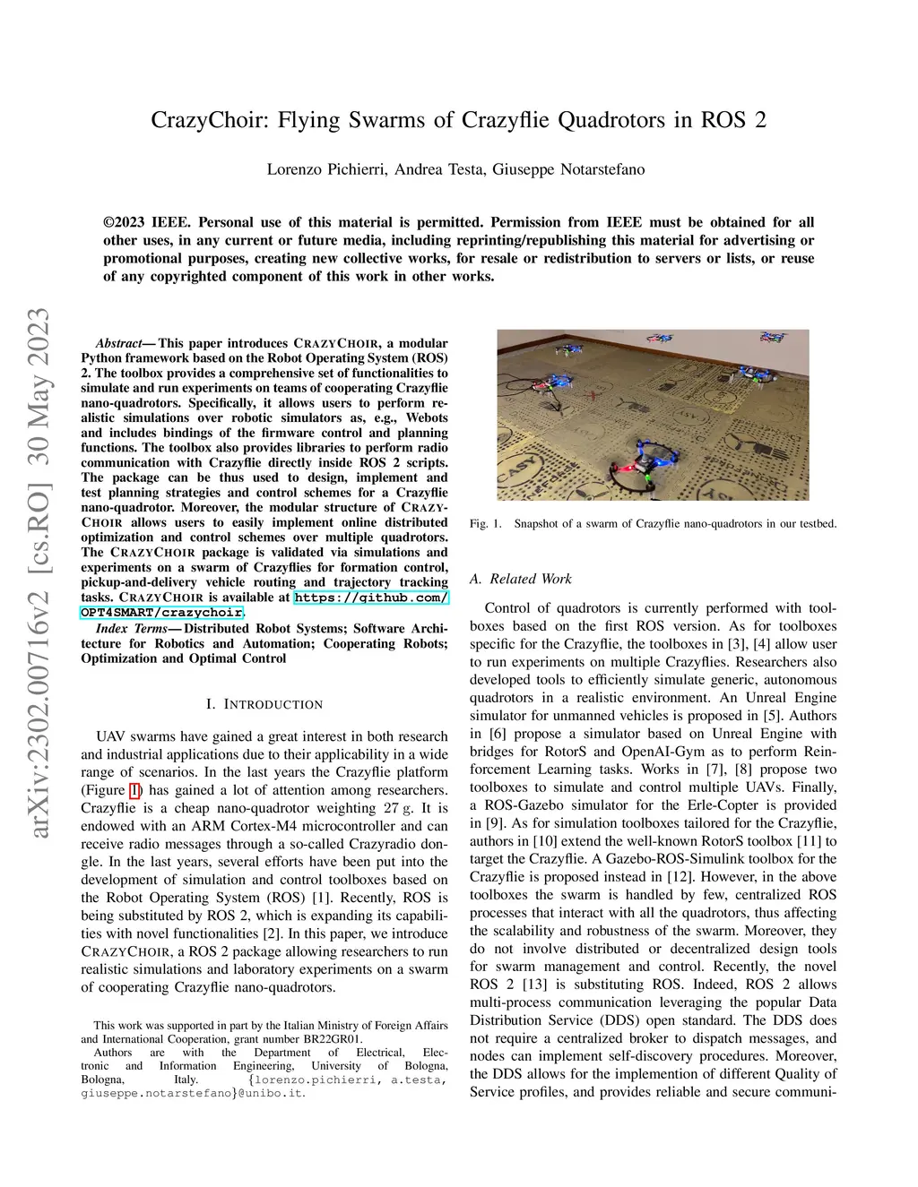 This paper introduces CrazyChoir, a modular Python framework based on the Robot Operating System (ROS) 2. The toolbox provides a comprehensive set of functionalities to simulate and run experiments on teams of cooperating Crazyflie nano-quadrotors. Specifically, it allows users to perform realistic simulations over robotic simulators as, e.g., Webots and includes bindings of the firmware control and planning functions. The toolbox also provides libraries to perform radio communication with Crazyflie directly inside ROS 2 scripts. The package can be thus used to design, implement and test planning strategies and control schemes for a Crazyflie nano-quadrotor. Moreover, the modular structure of CrazyChoir allows users to easily implement online distributed optimization and control schemes over multiple quadrotors. The CrazyChoir package is validated via simulations and experiments on a swarm of Crazyflies for formation control, pickup-and-delivery vehicle routing and trajectory tracking tasks. CrazyChoir is available at https://github.com/OPT4SMART/crazychoir.