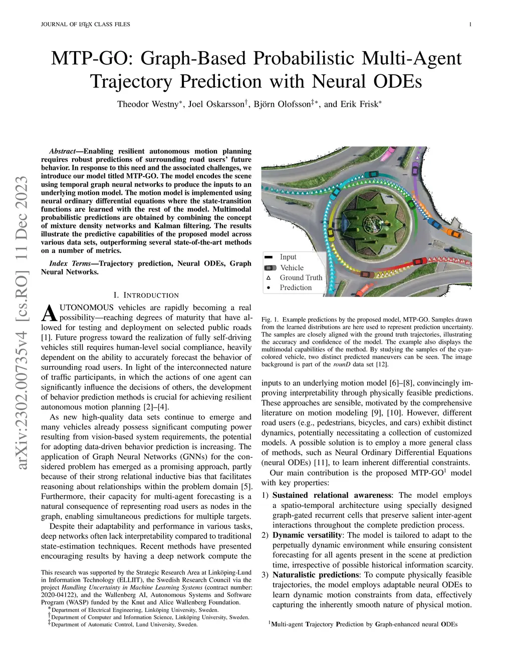 Enabling resilient autonomous motion planning requires robust predictions of surrounding road users' future behavior. In response to this need and the associated challenges, we introduce our model, titled MTP-GO. The model encodes the scene using temporal graph neural networks to produce the inputs to an underlying motion model. The motion model is implemented using neural ordinary differential equations where the state-transition functions are learned with the rest of the model. Multi-modal probabilistic predictions are provided by combining the concept of mixture density networks and Kalman filtering. The results illustrate the predictive capabilities of the proposed model across various data sets, outperforming several state-of-the-art methods on a number of metrics.