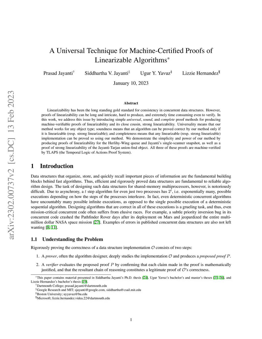 Linearizability has been the long standing gold standard for consistency in concurrent data structures. However, proofs of linearizability can be long and intricate, hard to produce, and extremely time consuming even to verify. In this work, we address this issue by introducing simple , , and proof methods for producing machine-verifiable proofs of linearizability and its close cousin, strong linearizability. Universality means that our method works for any object type; soundness means that an algorithm can be proved correct by our method only if it is linearizable (resp. strong linearizable); and completeness means that any linearizable (resp. strong linearizable) implementation can be proved so using our method. We demonstrate the simplicity and power of our method by producing proofs of linearizability for the Herlihy-Wing queue and Jayanti's single-scanner snapshot, as well as a proof of strong linearizability of the Jayanti-Tarjan union-find object. All three of these proofs are machine-verified by TLAPS (the Temporal Logic of Actions Proof System).
