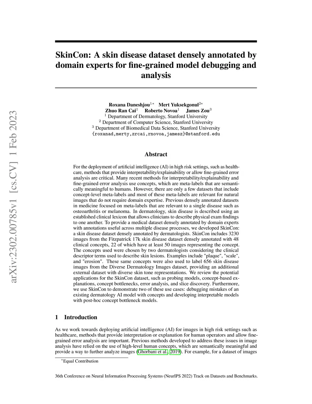 For the deployment of artificial intelligence (AI) in high-risk settings, such as healthcare, methods that provide interpretability/explainability or allow fine-grained error analysis are critical. Many recent methods for interpretability/explainability and fine-grained error analysis use concepts, which are meta-labels that are semantically meaningful to humans. However, there are only a few datasets that include concept-level meta-labels and most of these meta-labels are relevant for natural images that do not require domain expertise. Densely annotated datasets in medicine focused on meta-labels that are relevant to a single disease such as melanoma. In dermatology, skin disease is described using an established clinical lexicon that allows clinicians to describe physical exam findings to one another. To provide a medical dataset densely annotated by domain experts with annotations useful across multiple disease processes, we developed SkinCon: a skin disease dataset densely annotated by dermatologists. SkinCon includes 3230 images from the Fitzpatrick 17k dataset densely annotated with 48 clinical concepts, 22 of which have at least 50 images representing the concept. The concepts used were chosen by two dermatologists considering the clinical descriptor terms used to describe skin lesions. Examples include "plaque", "scale", and "erosion". The same concepts were also used to label 656 skin disease images from the Diverse Dermatology Images dataset, providing an additional external dataset with diverse skin tone representations. We review the potential applications for the SkinCon dataset, such as probing models, concept-based explanations, and concept bottlenecks. Furthermore, we use SkinCon to demonstrate two of these use cases: debugging mistakes of an existing dermatology AI model with concepts and developing interpretable models with post-hoc concept bottleneck models.