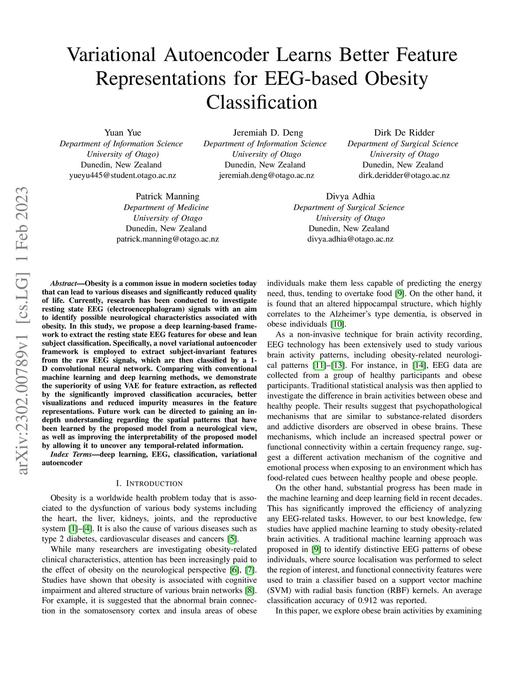 Obesity is a common issue in modern societies today that can lead to various diseases and significantly reduced quality of life. Currently, research has been conducted to investigate resting state EEG (electroencephalogram) signals with an aim to identify possible neurological characteristics associated with obesity. In this study, we propose a deep learning-based framework to extract the resting state EEG features for obese and lean subject classification. Specifically, a novel variational autoencoder framework is employed to extract subject-invariant features from the raw EEG signals, which are then classified by a 1-D convolutional neural network. Comparing with conventional machine learning and deep learning methods, we demonstrate the superiority of using VAE for feature extraction, as reflected by the significantly improved classification accuracies, better visualizations and reduced impurity measures in the feature representations. Future work can be directed to gaining an in-depth understanding regarding the spatial patterns that have been learned by the proposed model from a neurological view, as well as improving the interpretability of the proposed model by allowing it to uncover any temporal-related information.