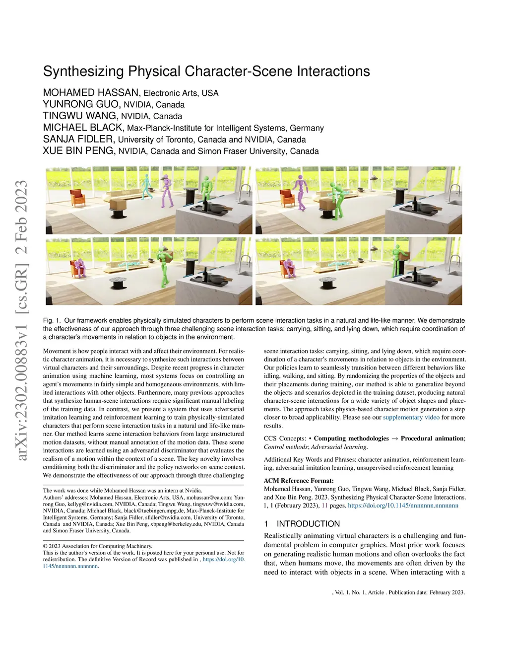 Movement is how people interact with and affect their environment. For realistic character animation, it is necessary to synthesize such interactions between virtual characters and their surroundings. Despite recent progress in character animation using machine learning, most systems focus on controlling an agent's movements in fairly simple and homogeneous environments, with limited interactions with other objects. Furthermore, many previous approaches that synthesize human-scene interactions require significant manual labeling of the training data. In contrast, we present a system that uses adversarial imitation learning and reinforcement learning to train physically-simulated characters that perform scene interaction tasks in a natural and life-like manner. Our method learns scene interaction behaviors from large unstructured motion datasets, without manual annotation of the motion data. These scene interactions are learned using an adversarial discriminator that evaluates the realism of a motion within the context of a scene. The key novelty involves conditioning both the discriminator and the policy networks on scene context. We demonstrate the effectiveness of our approach through three challenging scene interaction tasks: carrying, sitting, and lying down, which require coordination of a character's movements in relation to objects in the environment. Our policies learn to seamlessly transition between different behaviors like idling, walking, and sitting. By randomizing the properties of the objects and their placements during training, our method is able to generalize beyond the objects and scenarios depicted in the training dataset, producing natural character-scene interactions for a wide variety of object shapes and placements. The approach takes physics-based character motion generation a step closer to broad applicability.