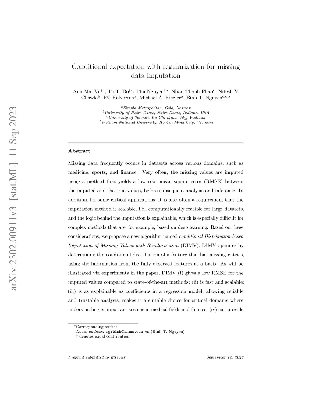 Missing data frequently occurs in datasets across various domains, such as medicine, sports, and finance. In many cases, to enable proper and reliable analyses of such data, the missing values are often imputed, and it is necessary that the method used has a low root mean square error (RMSE) between the imputed and the true values. In addition, for some critical applications, it is also often a requirement that the imputation method is scalable and the logic behind the imputation is explainable, which is especially difficult for complex methods that are, for example, based on deep learning. Based on these considerations, we propose a new algorithm named "conditional Distribution-based Imputation of Missing Values with Regularization" (DIMV). DIMV operates by determining the conditional distribution of a feature that has missing entries, using the information from the fully observed features as a basis. As will be illustrated via experiments in the paper, DIMV (i) gives a low RMSE for the imputed values compared to state-of-the-art methods; (ii) fast and scalable; (iii) is explainable as coefficients in a regression model, allowing reliable and trustable analysis, makes it a suitable choice for critical domains where understanding is important such as in medical fields, finance, etc; (iv) can provide an approximated confidence region for the missing values in a given sample; (v) suitable for both small and large scale data; (vi) in many scenarios, does not require a huge number of parameters as deep learning approaches; (vii) handle multicollinearity in imputation effectively; and (viii) is robust to the normally distributed assumption that its theoretical grounds rely on.