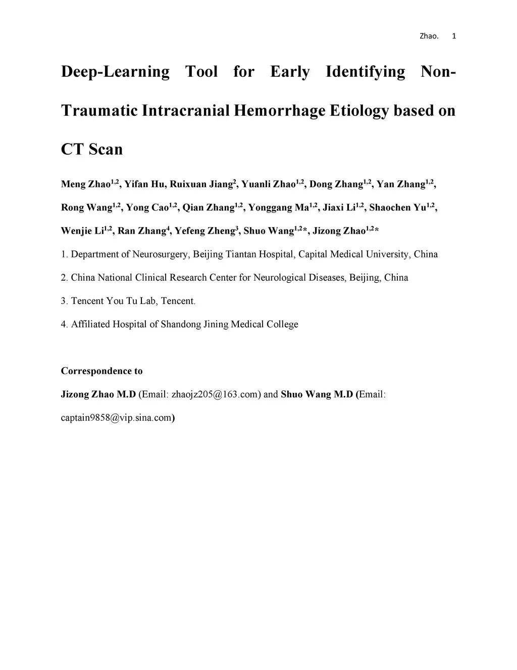Deep-Learning Tool for Early Identifying Non-Traumatic Intracranial