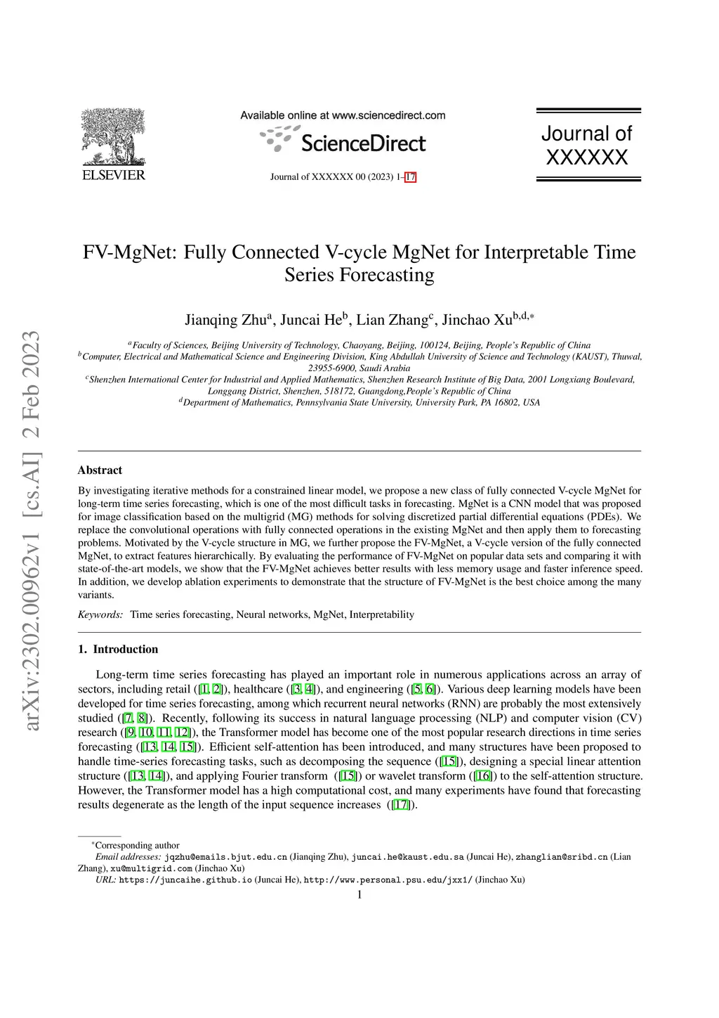By investigating iterative methods for a constrained linear model, we propose a new class of fully connected V-cycle MgNet for long-term time series forecasting, which is one of the most difficult tasks in forecasting. MgNet is a CNN model that was proposed for image classification based on the multigrid (MG) methods for solving discretized partial differential equations (PDEs). We replace the convolutional operations with fully connected operations in the existing MgNet and then apply them to forecasting problems. Motivated by the V-cycle structure in MG, we further propose the FV-MgNet, a V-cycle version of the fully connected MgNet, to extract features hierarchically. By evaluating the performance of FV-MgNet on popular data sets and comparing it with state-of-the-art models, we show that the FV-MgNet achieves better results with less memory usage and faster inference speed. In addition, we develop ablation experiments to demonstrate that the structure of FV-MgNet is the best choice among the many variants.