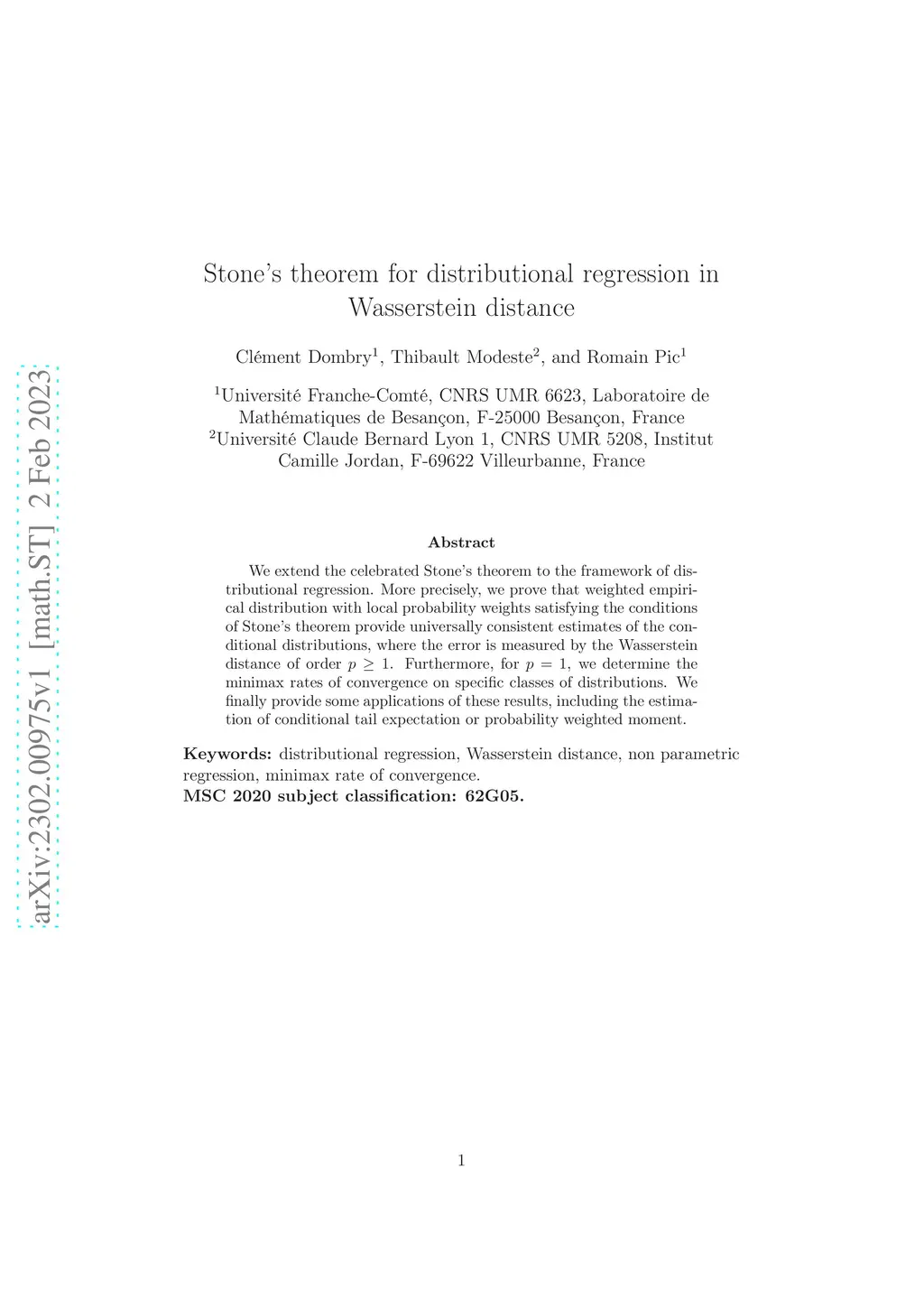 We extend the celebrated Stone's theorem to the framework of distributional regression. More precisely, we prove that weighted empirical distribution with local probability weights satisfying the conditions of Stone's theorem provide universally consistent estimates of the conditional distributions, where the error is measured by the Wasserstein distance of order p 1. Furthermore, for p = 1, we determine the minimax rates of convergence on specific classes of distributions. We finally provide some applications of these results, including the estimation of conditional tail expectation or probability weighted moment.