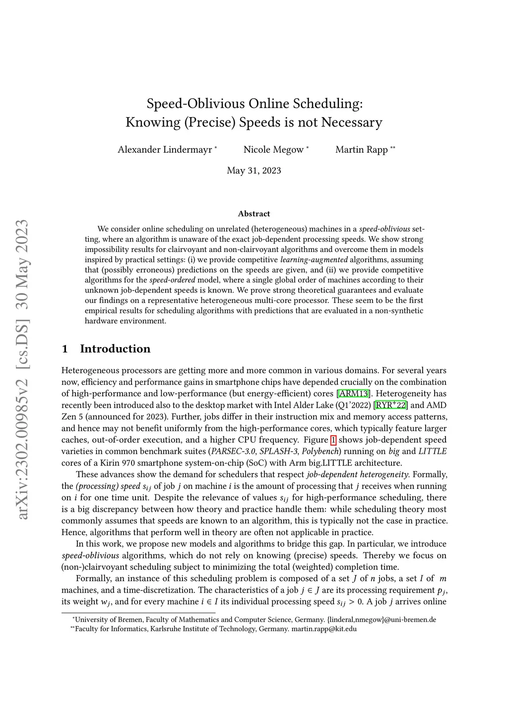 We consider online scheduling on unrelated (heterogeneous) machines in a speed-oblivious setting, where an algorithm is unaware of the exact job-dependent processing speeds. We show strong impossibility results for clairvoyant and non-clairvoyant algorithms and overcome them in models inspired by practical settings: (i) we provide competitive learning-augmented algorithms, assuming that (possibly erroneous) predictions on the speeds are given, and (ii) we provide competitive algorithms for the speed-ordered model, where a single global order of machines according to their unknown job-dependent speeds is known. We prove strong theoretical guarantees and evaluate our findings on a representative heterogeneous multi-core processor. These seem to be the first empirical results for scheduling algorithms with predictions that are evaluated in a non-synthetic hardware environment.