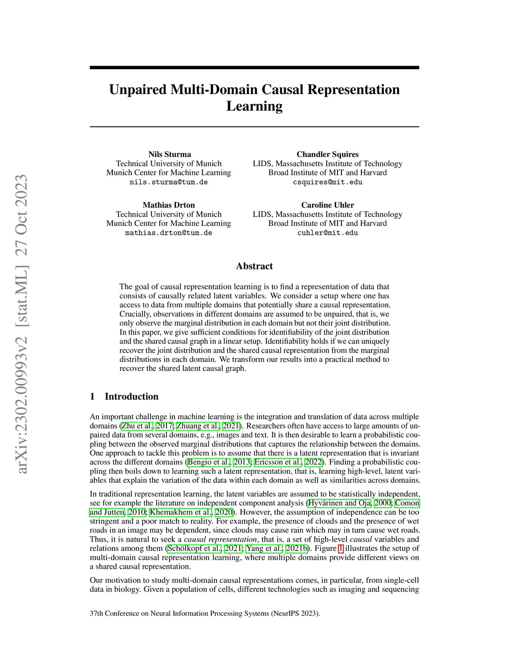 The goal of causal representation learning is to find a representation of data that consists of causally related latent variables. We consider a setup where one has access to data from multiple domains that potentially share a causal representation. Crucially, observations in different domains are assumed to be unpaired, that is, we only observe the marginal distribution in each domain but not their joint distribution. In this paper, we give sufficient conditions for identifiability of the joint distribution and the shared causal graph in a linear setup. Identifiability holds if we can uniquely recover the joint distribution and the shared causal representation from the marginal distributions in each domain. We transform our identifiability results into a practical method to recover the shared latent causal graph.