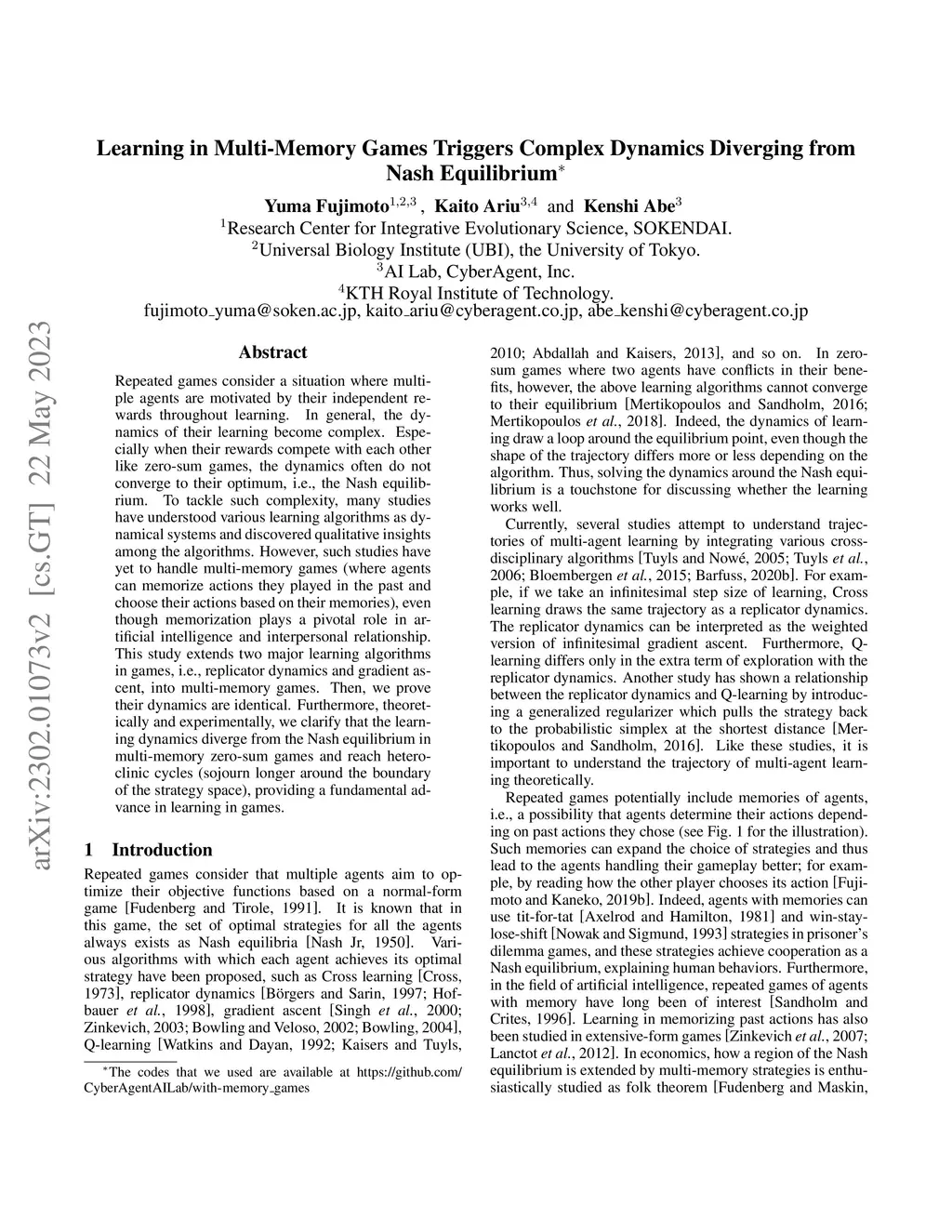 Repeated games consider a situation where multiple agents are motivated by their independent rewards throughout learning. In general, the dynamics of their learning become complex. Especially when their rewards compete with each other like zero-sum games, the dynamics often do not converge to their optimum, i.e., the Nash equilibrium. To tackle such complexity, many studies have understood various learning algorithms as dynamical systems and discovered qualitative insights among the algorithms. However, such studies have yet to handle multi-memory games (where agents can memorize actions they played in the past and choose their actions based on their memories), even though memorization plays a pivotal role in artificial intelligence and interpersonal relationship. This study extends two major learning algorithms in games, i.e., replicator dynamics and gradient ascent, into multi-memory games. Then, we prove their dynamics are identical. Furthermore, theoretically and experimentally, we clarify that the learning dynamics diverge from the Nash equilibrium in multi-memory zero-sum games and reach heteroclinic cycles (sojourn longer around the boundary of the strategy space), providing a fundamental advance in learning in games.