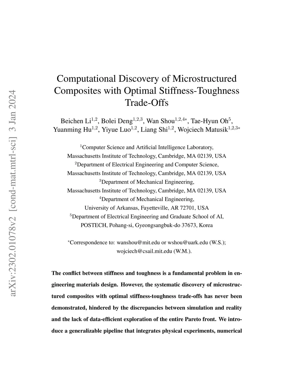 The conflict between stiffness and toughness is a fundamental problem in engineering materials design. However, the systematic discovery of microstructured composites with optimal stiffness-toughness trade-offs has never been demonstrated, hindered by the discrepancies between simulation and reality and the lack of data-efficient exploration of the entire Pareto front. We introduce a generalizable pipeline that integrates physical experiments, numerical simulations, and artificial neural networks to address both challenges. Without any prescribed expert knowledge of material design, our approach implements a nested-loop proposal-validation workflow to bridge the simulation-to-reality gap and discover microstructured composites that are stiff and tough with high sample efficiency. Further analysis of Pareto-optimal designs allows us to automatically identify existing toughness enhancement mechanisms, which were previously discovered through trial-and-error or biomimicry. On a broader scale, our method provides a blueprint for computational design in various research areas beyond solid mechanics, such as polymer chemistry, fluid dynamics, meteorology, and robotics.
