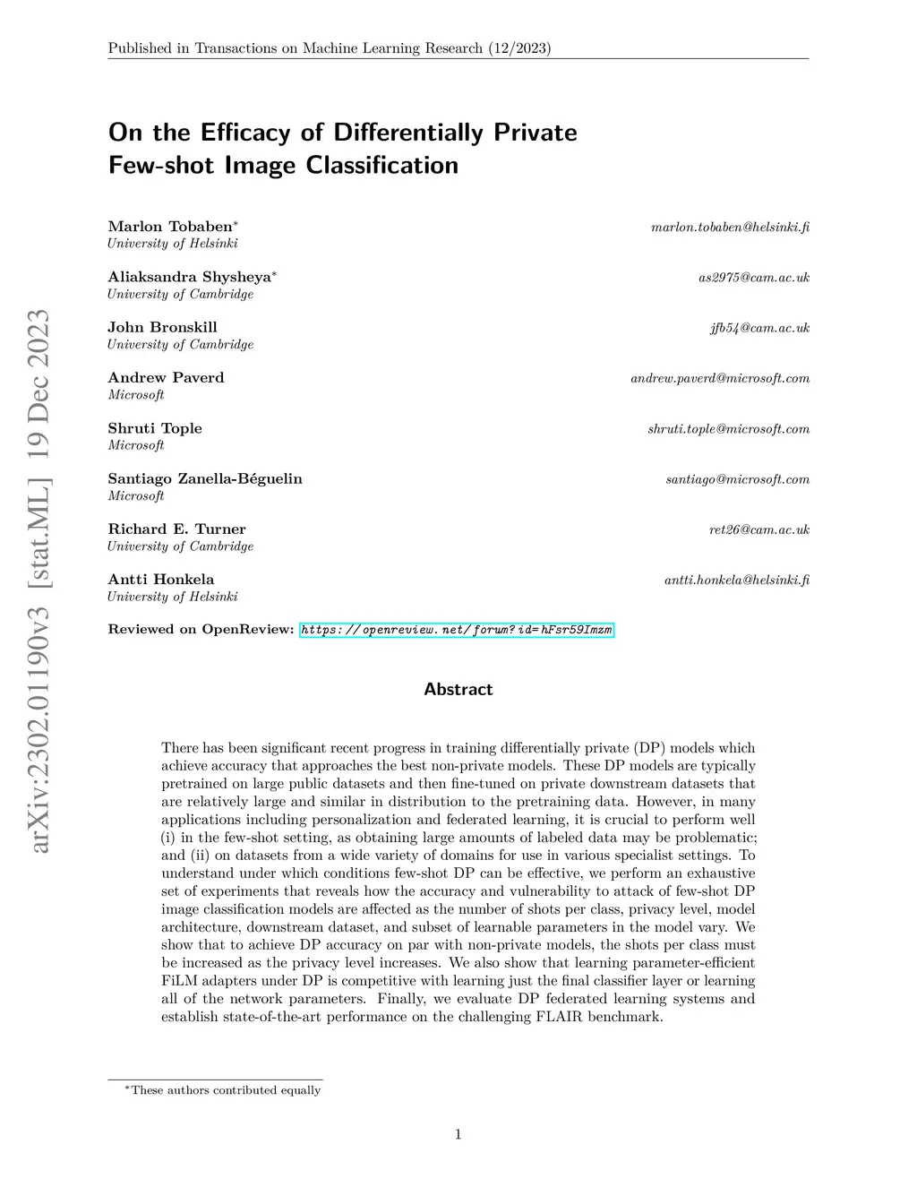 There has been significant recent progress in training differentially private (DP) models which achieve accuracy that approaches the best non-private models. These DP models are typically pretrained on large public datasets and then fine-tuned on private downstream datasets that are relatively large and similar in distribution to the pretraining data. However, in many applications including personalization and federated learning, it is crucial to perform well (i) in the few-shot setting, as obtaining large amounts of labeled data may be problematic; and (ii) on datasets from a wide variety of domains for use in various specialist settings. To understand under which conditions few-shot DP can be effective, we perform an exhaustive set of experiments that reveals how the accuracy and vulnerability to attack of few-shot DP image classification models are affected as the number of shots per class, privacy level, model architecture, downstream dataset, and subset of learnable parameters in the model vary. We show that to achieve DP accuracy on par with non-private models, the shots per class must be increased as the privacy level increases. We also show that learning parameter-efficient FiLM adapters under DP is competitive with learning just the final classifier layer or learning all of the network parameters. Finally, we evaluate DP federated learning systems and establish state-of-the-art performance on the challenging FLAIR benchmark.