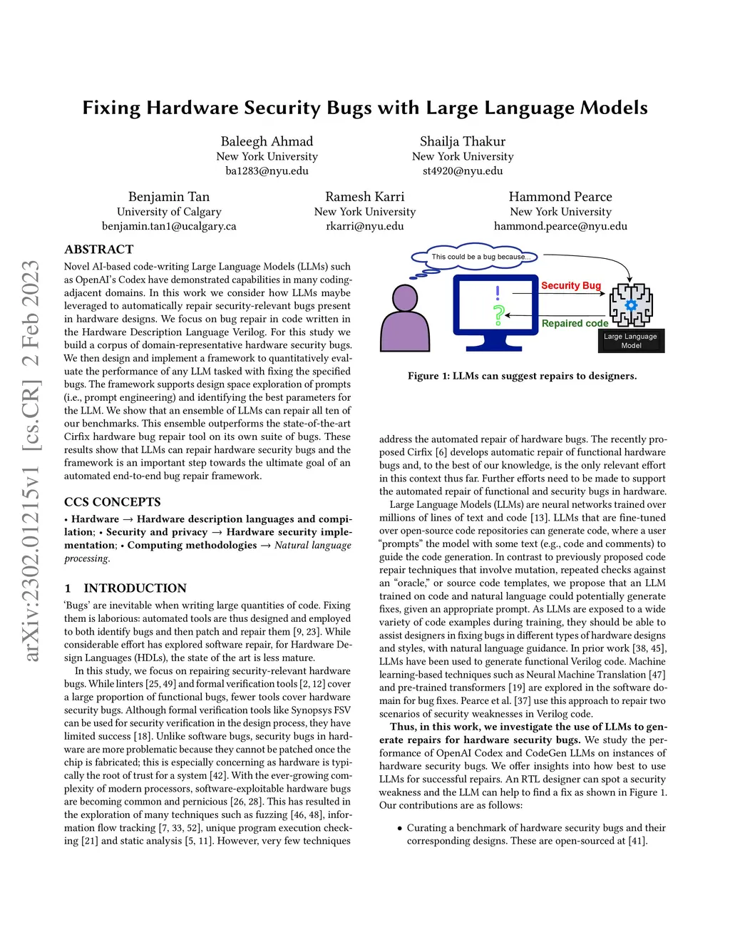 Novel AI-based code-writing Large Language Models (LLMs) such as OpenAI's Codex have demonstrated capabilities in many coding-adjacent domains. In this work we consider how LLMs maybe leveraged to automatically repair security relevant bugs present in hardware designs. We focus on bug repair in code written in the Hardware Description Language Verilog. For this study we build a corpus of domain-representative hardware security bugs. We then design and implement a framework to quantitatively evaluate the performance of any LLM tasked with fixing the specified bugs. The framework supports design space exploration of prompts (i.e., prompt engineering) and identifying the best parameters for the LLM. We show that an ensemble of LLMs can repair all ten of our benchmarks. This ensemble outperforms the state-of-the-art Cirfix hardware bug repair tool on its own suite of bugs. These results show that LLMs can repair hardware security bugs and the framework is an important step towards the ultimate goal of an automated end-to-end bug repair framework.