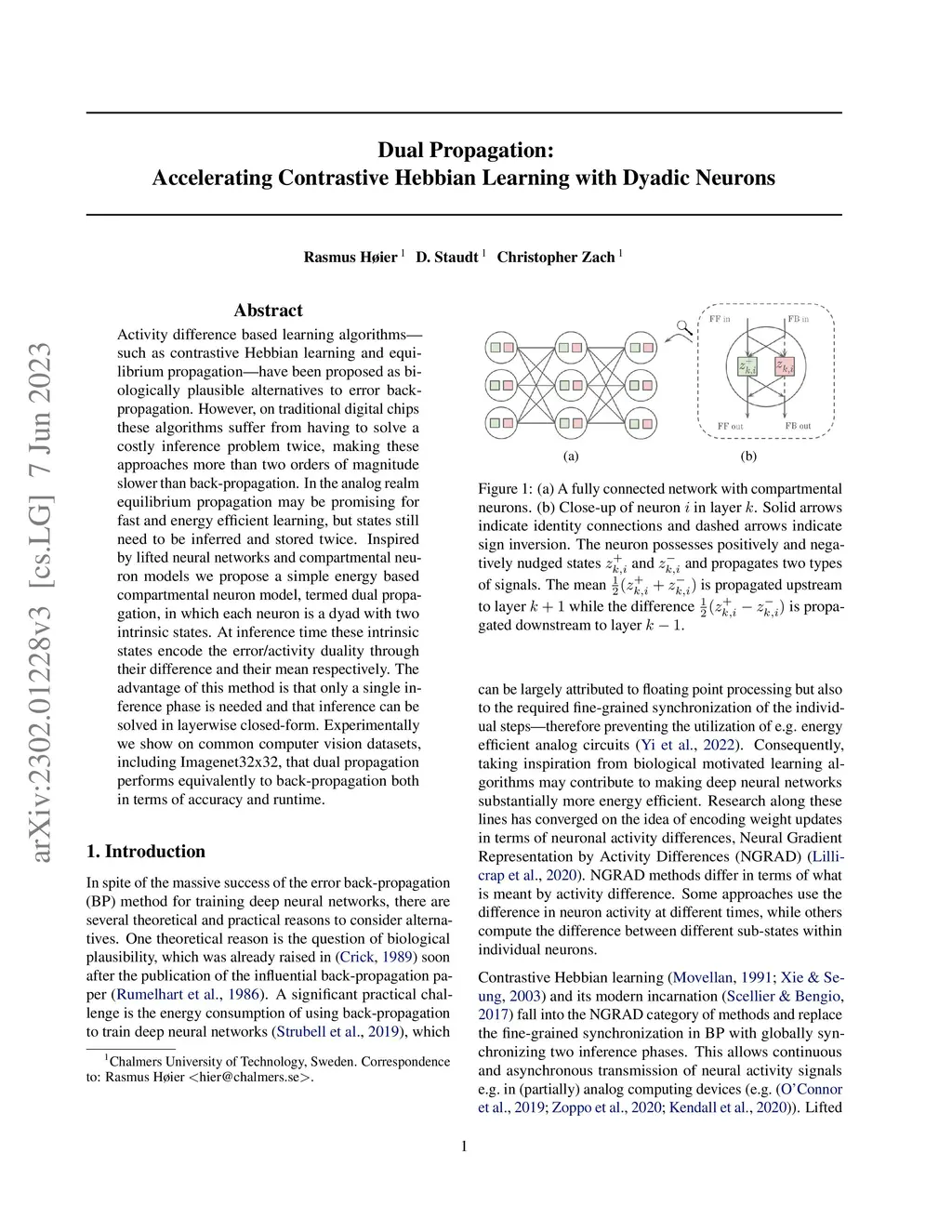 Activity difference based learning algorithms-such as contrastive Hebbian learning and equilibrium propagation-have been proposed as biologically plausible alternatives to error back-propagation. However, on traditional digital chips these algorithms suffer from having to solve a costly inference problem twice, making these approaches more than two orders of magnitude slower than back-propagation. In the analog realm equilibrium propagation may be promising for fast and energy efficient learning, but states still need to be inferred and stored twice. Inspired by lifted neural networks and compartmental neuron models we propose a simple energy based compartmental neuron model, termed dual propagation, in which each neuron is a dyad with two intrinsic states. At inference time these intrinsic states encode the error/activity duality through their difference and their mean respectively. The advantage of this method is that only a single inference phase is needed and that inference can be solved in layerwise closed-form. Experimentally we show on common computer vision datasets, including Imagenet32x32, that dual propagation performs equivalently to back-propagation both in terms of accuracy and runtime.