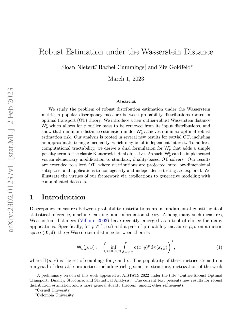 We study the problem of robust distribution estimation under the Wasserstein metric, a popular discrepancy measure between probability distributions rooted in optimal transport (OT) theory. We introduce a new outlier-robust Wasserstein distance which allows for outlier mass to be removed from its input distributions, and show that minimum distance estimation under achieves minimax optimal robust estimation risk. Our analysis is rooted in several new results for partial OT, including an approximate triangle inequality, which may be of independent interest. To address computational tractability, we derive a dual formulation for that adds a simple penalty term to the classic Kantorovich dual objective. As such, can be implemented via an elementary modification to standard, duality-based OT solvers. Our results are extended to sliced OT, where distributions are projected onto low-dimensional subspaces, and applications to homogeneity and independence testing are explored. We illustrate the virtues of our framework via applications to generative modeling with contaminated datasets.