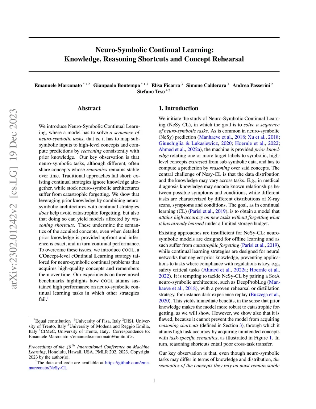 We introduce Neuro-Symbolic Continual Learning, where a model has to solve a sequence of neuro-symbolic tasks, that is, it has to map sub-symbolic inputs to high-level concepts and compute predictions by reasoning consistently with prior knowledge. Our key observation is that neuro-symbolic tasks, although different, often share concepts whose semantics remains stable over time. Traditional approaches fall short: existing continual strategies ignore knowledge altogether, while stock neuro-symbolic architectures suffer from catastrophic forgetting. We show that leveraging prior knowledge by combining neuro-symbolic architectures with continual strategies does help avoid catastrophic forgetting, but also that doing so can yield models affected by reasoning shortcuts. These undermine the semantics of the acquired concepts, even when detailed prior knowledge is provided upfront and inference is exact, and in turn continual performance. To overcome these issues, we introduce COOL, a COncept-level cOntinual Learning strategy tailored for neuro-symbolic continual problems that acquires high-quality concepts and remembers them over time. Our experiments on three novel benchmarks highlights how COOL attains sustained high performance on neuro-symbolic continual learning tasks in which other strategies fail.