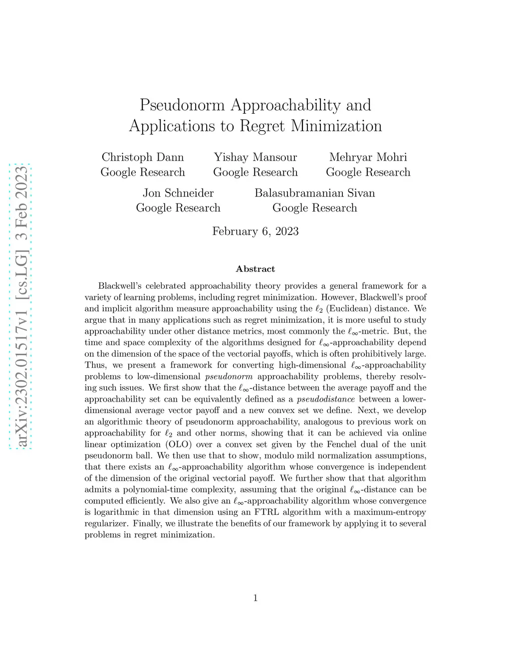Blackwell's celebrated approachability theory provides a general framework for a variety of learning problems, including regret minimization. However, Blackwell's proof and implicit algorithm measure approachability using the (Euclidean) distance. We argue that in many applications such as regret minimization, it is more useful to study approachability under other distance metrics, most commonly the -metric. But, the time and space complexity of the algorithms designed for -approachability depend on the dimension of the space of the vectorial payoffs, which is often prohibitively large. Thus, we present a framework for converting high-dimensional -approachability problems to low-dimensional pseudonorm approachability problems, thereby resolving such issues. We first show that the -distance between the average payoff and the approachability set can be equivalently defined as a pseudodistance between a lower-dimensional average vector payoff and a new convex set we define. Next, we develop an algorithmic theory of pseudonorm approachability, analogous to previous work on approachability for and other norms, showing that it can be achieved via online linear optimization (OLO) over a convex set given by the Fenchel dual of the unit pseudonorm ball. We then use that to show, modulo mild normalization assumptions, that there exists an -approachability algorithm whose convergence is independent of the dimension of the original vectorial payoff. We further show that that algorithm admits a polynomial-time complexity, assuming that the original -distance can be computed efficiently. We also give an -approachability algorithm whose convergence is logarithmic in that dimension using an FTRL algorithm with a maximum-entropy regularizer.
